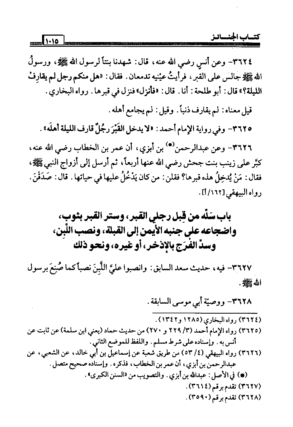 3625 - وَفِي رِوَايَة الإِمَام أَحْمد: " لَا يدْخل الْقَبْر رجل قارف اللَّيْلَة أَهله ".