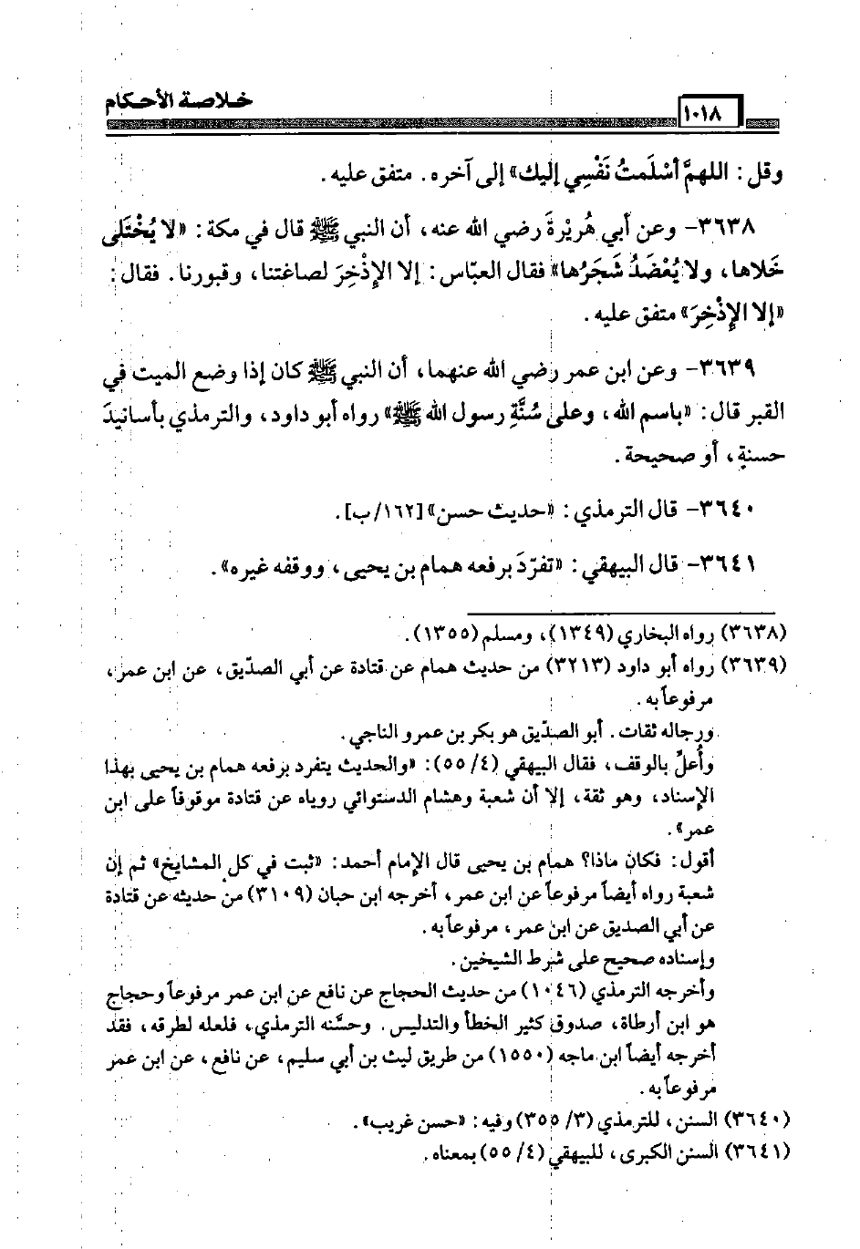 3638 - وَعَن أبي هُرَيْرَة رَضِيَ اللَّهُ عَنْه، أَن النَّبِي صَلَّى اللَّهُ عَلَيْهِ وَسَلَّم َ قَالَ فِي مَكَّة: " لَا يُخْتَلَى خَلاهَا، وَلَا يعضد شَجَرهَا " فَقَالَ الْعَبَّاس: إِلَّا الْإِذْخر لصاغتنا، وَقُبُورنَا. فَقَالَ: " إِلَّا الْإِذْخر " مُتَّفق عَلَيْهِ.