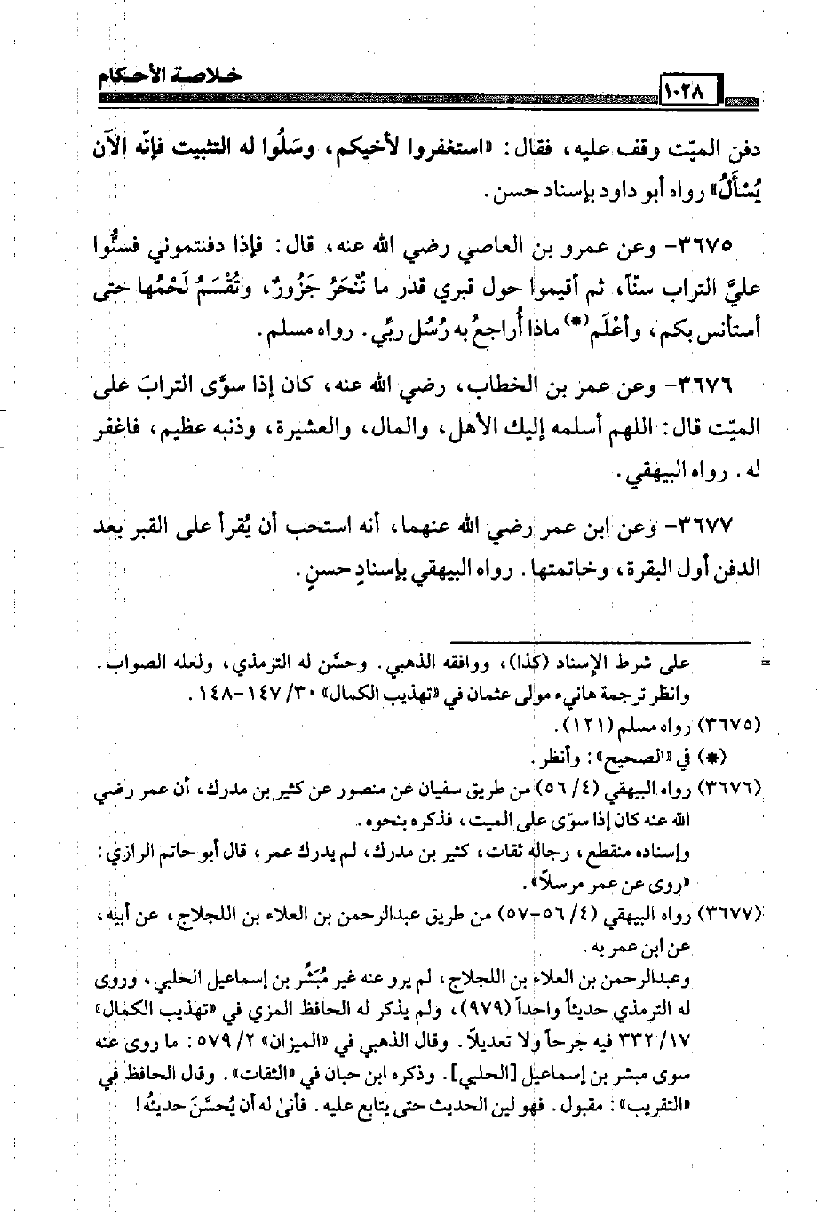 3676 - وَعَن عمر بن الْخطاب، رَضِيَ اللَّهُ عَنْه، كَانَ إِذا سُوَى التُّرَاب عَلَى الْمَيِّت قَالَ: اللَّهُمَّ أسلمه إِلَيْك الْأَهْل، وَالْمَال، وَالْعشيرَة، وذنبه عَظِيم، فَاغْفِر لَهُ. رَوَاهُ الْبَيْهَقِيّ.