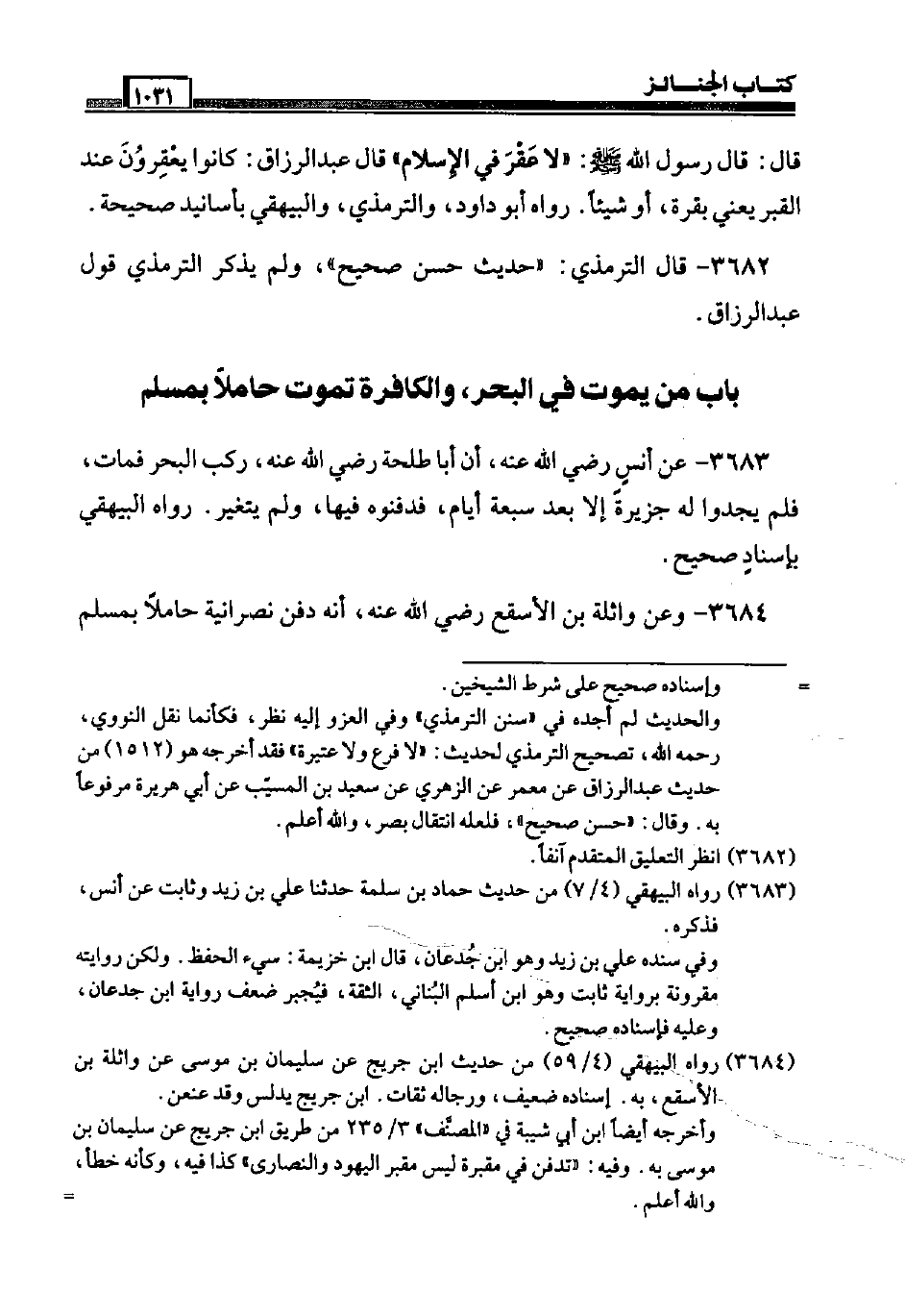 3683 - عَن أنس رَضِيَ اللَّهُ عَنْه، أَن أَبَا طَلْحَة رَضِيَ اللَّهُ عَنْه، ركب الْبَحْر فَمَاتَ، فَلم يَجدوا لَهُ جَزِيرَة إِلَّا بعد سَبْعَة أَيَّام، فدفنوه فِيهَا، وَلم يتَغَيَّر. رَوَاهُ الْبَيْهَقِيّ بِإِسْنَاد صَحِيح.