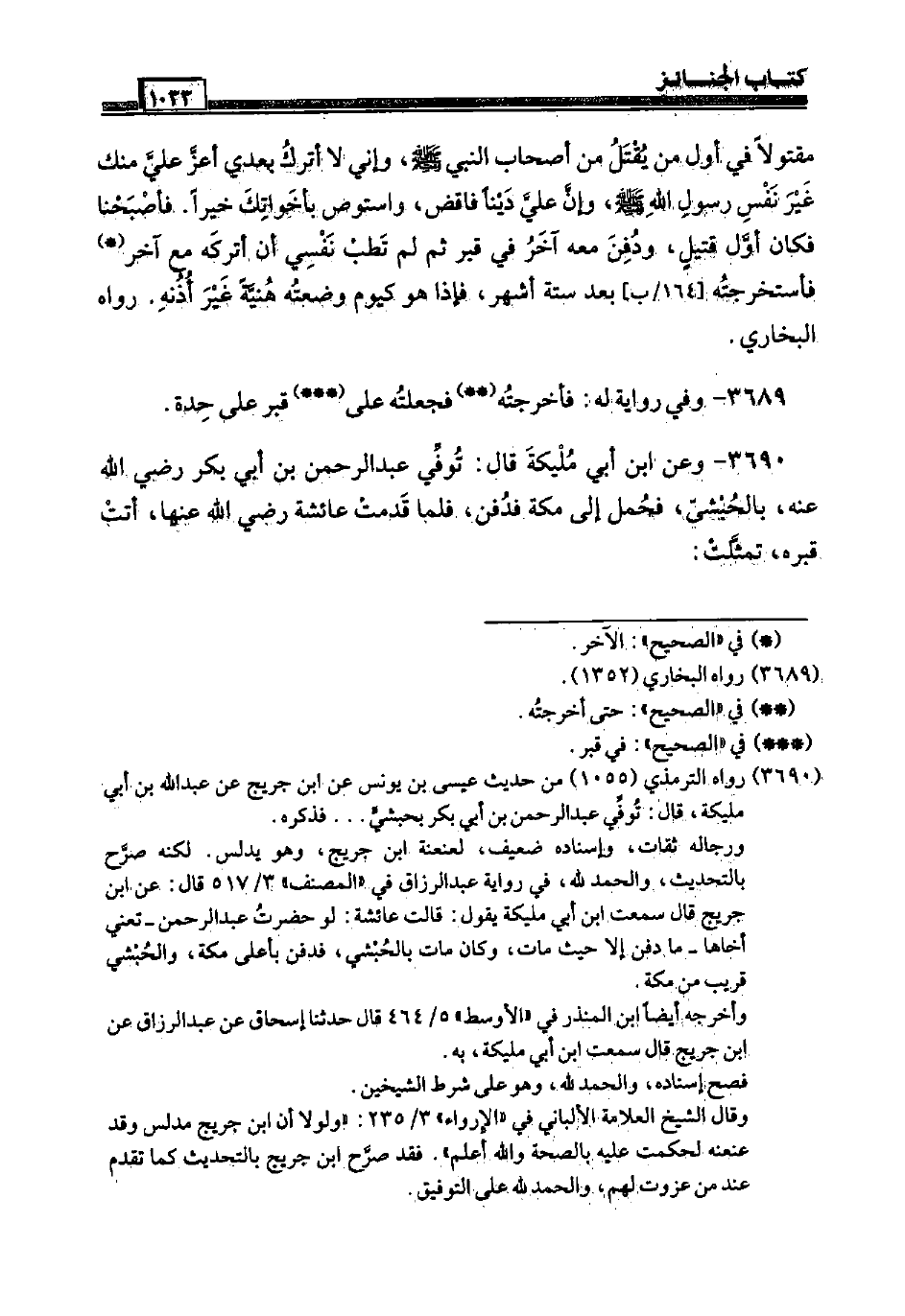 3690 - وَعَن ابْن أبي مليكَة قَالَ: توفّي عبد الرَّحْمَن بن أبي بكر رَضِيَ اللَّهُ عَنْه، بالحبشي، فَحمل إِلَى مَكَّة فَدفن، فَلَمَّا قدمت عَائِشَة رَضِيَ اللَّهُ عَنْها، أَتَت قَبره، تمثلت: