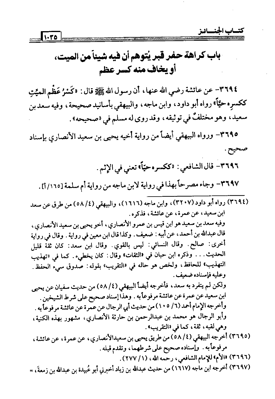 3694 - عَن عَائِشَة رَضِيَ اللَّهُ عَنْها، أَن رَسُول الله صَلَّى اللَّهُ عَلَيْهِ وَسَلَّم َ قَالَ: " كسر عظم الْمَيِّت ككسره حَيا " رَوَاهُ أَبُو دَاوُد، وَابْن مَاجَه، وَالْبَيْهَقِيّ بأسانيد صَحِيحَة، وَفِيه سعد بن سعيد، وَهُوَ مُخْتَلف فِي توثيقه، وَقد رَوَى لَهُ مُسلم فِي " صَحِيحه ".