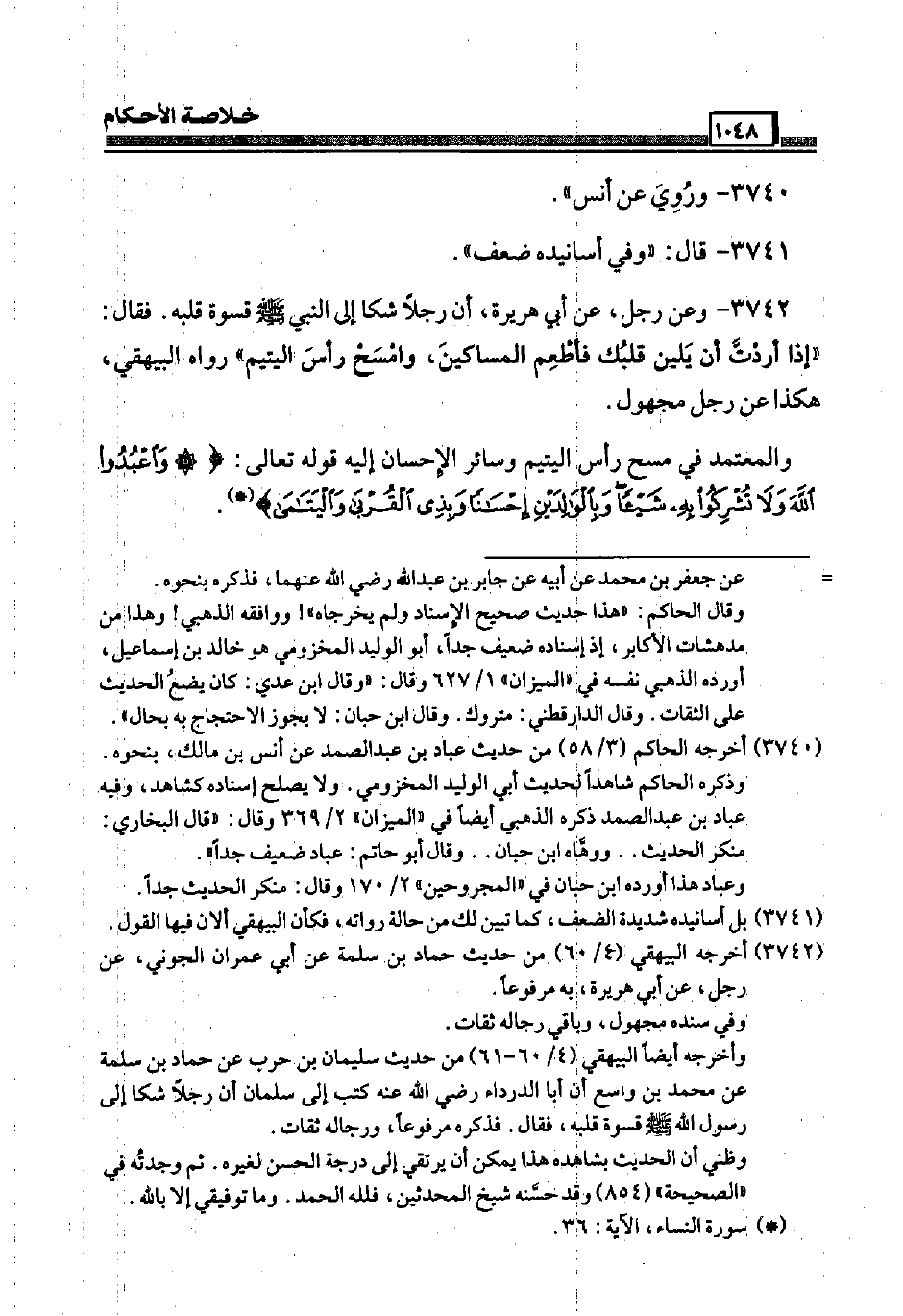 3742 - وَعَن رجل، عَن أبي هُرَيْرَة، أَن رجلا شكا إِلَى النَّبِي صَلَّى اللَّهُ عَلَيْهِ وَسَلَّم َ قسوة قلبه. فَقَالَ: " إِذا أردْت أَن يلين قَلْبك فأطعم الْمَسَاكِين، وامسح رَأس الْيَتِيم " رَوَاهُ الْبَيْهَقِيّ، هَكَذَا عَن رجل مَجْهُول. وَالْمُعْتَمد فِي مسح رَأس الْيَتِيم وَسَائِر الْإِحْسَان إِلَيْهِ قَوْله تَعَالَى: {واعبدوا الله وَلَا تُشْرِكُوا بِهِ شَيْئا وبالوالدين إحسانا وبذي الْقُرْبَى واليتامى}
