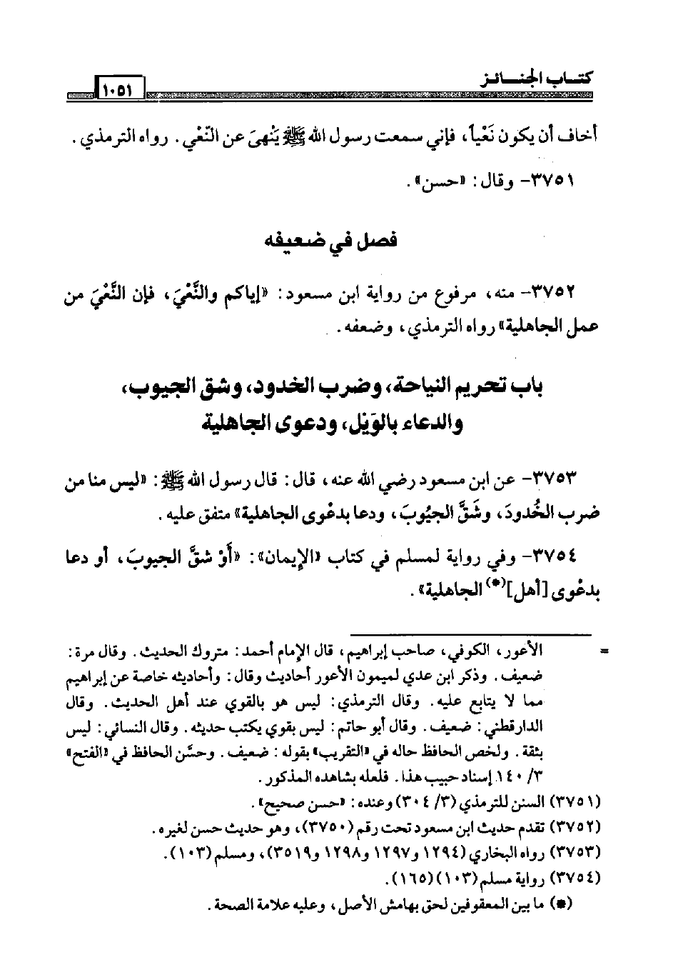 3753 - عَن ابْن مَسْعُود رَضِيَ اللَّهُ عَنْه، قَالَ: قَالَ رَسُول الله صَلَّى اللَّهُ عَلَيْهِ وَسَلَّم َ: " لَيْسَ منا من ضرب الخدود، وشق الْجُيُوب، ودعا بِدَعْوَى الْجَاهِلِيَّة " مُتَّفق عَلَيْهِ.