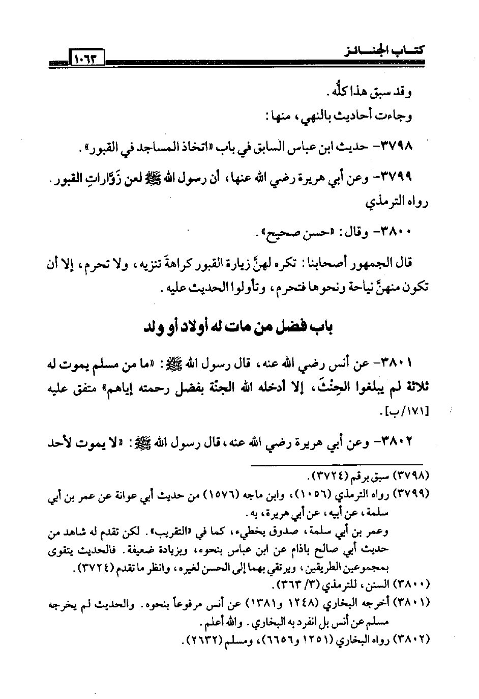 3800 - وَقَالَ: " حسن صَحِيح ". قَالَ الْجُمْهُور أَصْحَابنَا: تكره لَهُنَّ زِيَارَة الْقُبُور كَرَاهَة تَنْزِيه، وَلَا تحرم، إِلَّا أَن تكون مِنْهُنَّ نياحة وَنَحْوهَا فَتحرم، وتأولوا الحَدِيث عَلَيْهِ.