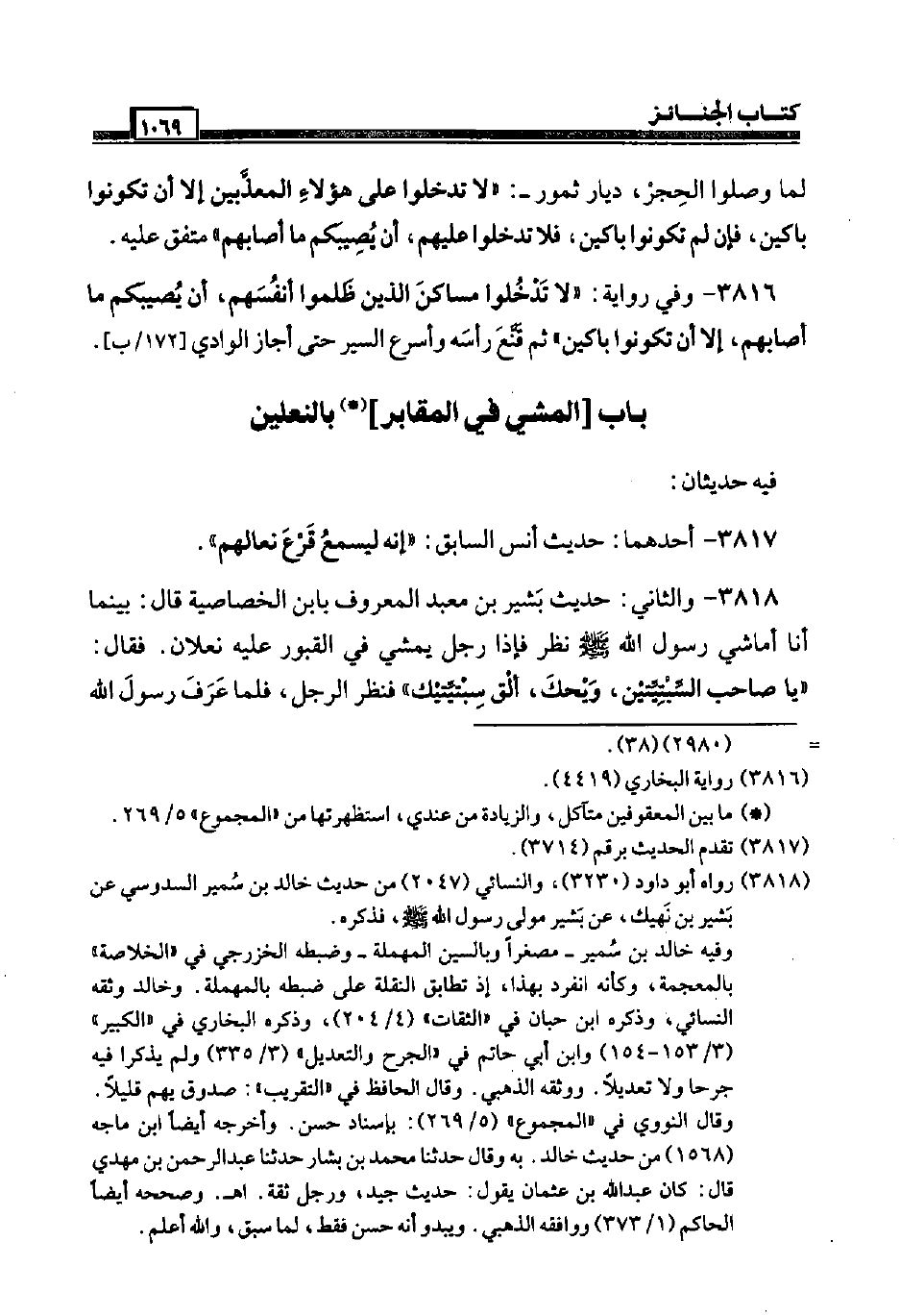 3818 - وَالثَّانِي: حَدِيث بشير بن معبد الْمَعْرُوف بِابْن الخصاصية قَالَ: بَيْنَمَا أَنا أماشي رَسُول الله صَلَّى اللَّهُ عَلَيْهِ وَسَلَّم َ نظر فَإِذا رجل يمشي فِي الْقُبُور عَلَيْهِ نَعْلَانِ. فَقَالَ: " يَا صَاحب السبتيتين، وَيحك، ألق سبتيتيك " فَنظر الرجل، فَلَمَّا عرف رَسُول الله