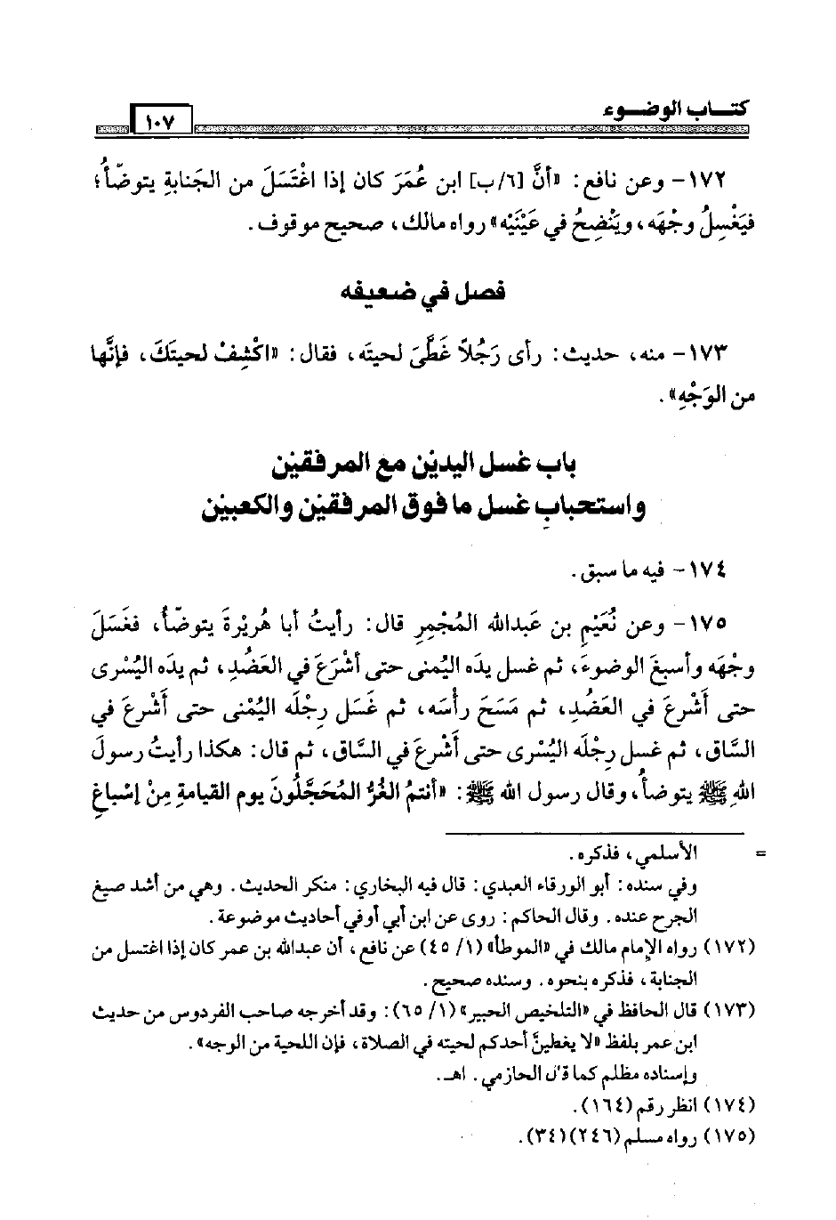 175 - وَعَن نعيم بن عبد الله المجمر قَالَ: رَأَيْت أَبَا هُرَيْرَة يتَوَضَّأ، فَغسل وَجهه وأسبغ الْوضُوء، ثمَّ غسل يَده الْيُمْنَى حَتَّى أشرع فِي الْعَضُد، ثمَّ يَده الْيُسْرَى حَتَّى أشرع فِي الْعَضُد، ثمَّ مسح رَأسه، ثمَّ غسل رجله الْيُمْنَى حَتَّى أشرع فِي السَّاق، ثمَّ غسل رجله الْيُسْرَى حَتَّى أشرع فِي السَّاق، ثمَّ قَالَ: هَكَذَا رَأَيْت رَسُول الله صَلَّى اللَّهُ عَلَيْهِ وَسَلَّم َ يتَوَضَّأ، وَقَالَ رَسُول الله صَلَّى اللَّهُ عَلَيْهِ وَسَلَّم َ: " أَنْتُم الغر المحجَّلون يَوْم الْقِيَامَة من إسباغ