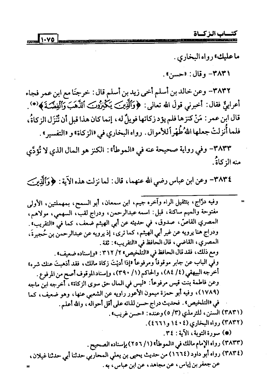 3832 - وَعَن خَالِد بن أسلم أخي زيد بن أسلم قَالَ: خرجنَا مَعَ ابْن عمر فجَاء أَعْرَابِي فَقَالَ: أَخْبرنِي قَول الله تَعَالَى: {وَالَّذين يكنزون الذَّهَب وَالْفِضَّة} . قَالَ ابْن عمر: من كنزها فَلم يؤد زَكَاتهَا فويل لَهُ، إِنَّمَا كَانَ هَذَا قبل أَن تنزل الزَّكَاة، فَلَمَّا أُنزلت جعلهَا الله طهرا للأموال. رَوَاهُ البُخَارِيّ فِي " الزَّكَاة " و " التَّفْسِير ".