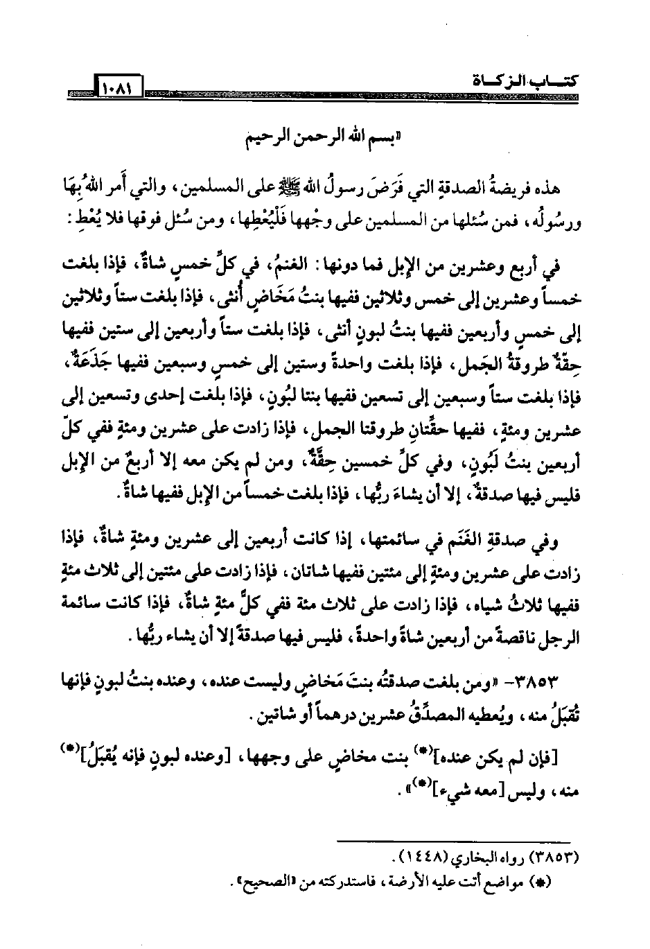 " بِسم الله الرَّحْمَن الرَّحِيم " هَذِه فَرِيضَة الصَّدَقَة الَّتِي فرض رَسُول الله صَلَّى اللَّهُ عَلَيْهِ وَسَلَّم َ عَلَى الْمُسلمين، وَالَّتِي أَمر الله بهَا وَرَسُوله، فَمن سئلها من الْمُسلمين عَلَى وَجههَا فليعطها، وَمن سُئِلَ فَوْقهَا فَلَا يُعْط: فِي أَربع وَعشْرين من الْإِبِل فَمَا دونهَا: الْغنم، فِي كل خمس شَاة، فَإِذا بلغت خمْسا وَعشْرين إِلَى خمس وَثَلَاثِينَ فَفِيهَا بنت مَخَاض أُنْثَى، فَإِذا بلغت سِتا وَثَلَاثِينَ إِلَى خمس وَأَرْبَعين فَفِيهَا بنت لبون أُنْثَى، فَإِذا بلغت سِتا وَأَرْبَعين إِلَى سِتِّينَ فَفِيهَا حقة طروقة الْجمل، فَإِذا بلغت وَاحِدَة وَسِتِّينَ إِلَى خمس وَسبعين فَفِيهَا جَذَعَة، فَإِذا بلغت سِتا وَسبعين إِلَى تسعين فَفِيهَا بِنْتا لبون، فَإِذا بلغت إِحْدَى وَتِسْعين إِلَى عشْرين ومئة، فَفِيهَا حقتان طروقتا الْجمل، فَإِذا زَادَت عَلَى عشْرين ومئة فَفِي كل أَرْبَعِينَ بنت لبون، وَفِي كل خمسين حقة، وَمن لم يكن مَعَه إِلَّا أَربع من الْإِبِل فَلَيْسَ فِيهَا صَدَقَة، إِلَّا أَن يَشَاء رَبهَا، فَإِذا بلغت خمْسا من الْإِبِل فَفِيهَا شَاة. وَفِي صَدَقَة الْغنم فِي سائمتها، إِذا كَانَت أَرْبَعِينَ إِلَى عشْرين ومئة شَاة، فَإِذا زَادَت عَلَى عشْرين ومئة إِلَى مئتين فَفِيهَا شَاتَان، فَإِذا زَادَت عَلَى مئتين إِلَى ثَلَاث مئة فَفِيهَا ثَلَاث شِيَاه، فَإِذا زَادَت عَلَى ثَلَاث مئة فَفِي كل مئة شَاة، فَإِذا كَانَت سَائِمَة الرجل نَاقِصَة من أَرْبَعِينَ شَاة وَاحِدَة، فَلَيْسَ فِيهَا صَدَقَة إِلَّا أَن يَشَاء رَبهَا.