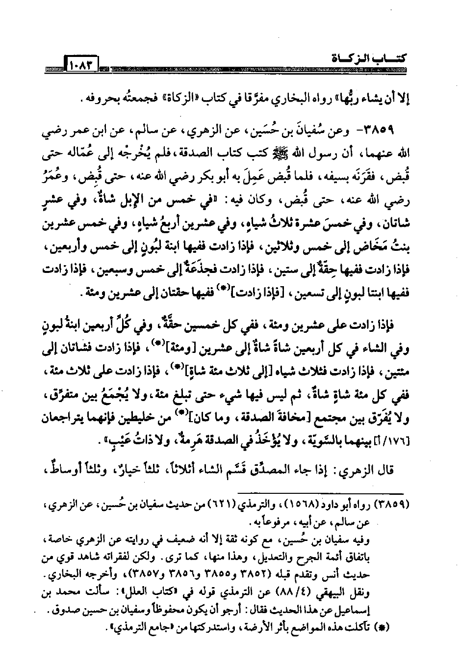 3859 - وَعَن سُفْيَان بن حُسَيْن، عَن الزُّهْرِيّ، عَن سَالم، عَن ابْن عمر رَضِيَ اللَّهُ عَنْهما، أَن رَسُول الله صَلَّى اللَّهُ عَلَيْهِ وَسَلَّم َ كتب كتاب الصَّدَقَة، فَلم يُخرجهُ إِلَى عماله حَتَّى قبض، فقرنه بِسَيْفِهِ، فَلَمَّا قبض عمل بِهِ أَبُو بكر رَضِيَ اللَّهُ عَنْه، حَتَّى قبض، وَعمر رَضِيَ اللَّهُ عَنْه، حَتَّى قبض، وَكَانَ فِيهِ: " فِي خمس من الْإِبِل شَاة، وَفِي عشر شَاتَان، وَفِي خمس عشرَة ثَلَاث شِيَاه، وَفِي عشْرين أَربع شِيَاه، وَفِي خمس عشْرين بنت مَخَاض إِلَى خمس وَثَلَاثِينَ، فَإِذا زَادَت فَفِيهَا ابْنة لبون إِلَى خمس وَأَرْبَعين، فَإِذا زَادَت فَفِيهَا حقة إِلَى سِتِّينَ، فَإِذا زَادَت فجذعة إِلَى خمس وَسبعين، فَإِذا زَادَت فَفِيهَا ابنتا لبون إِلَى تسعين، [فَإِذا زَادَت] فَفِيهَا حقتان إِلَى عشْرين ومئة. فَإِذا زَادَت عَلَى عشْرين ومئة، فَفِي كل خمسين حقة، وَفِي كل أَرْبَعِينَ ابْنة لبون وَفِي الشَّاء فِي كل أَرْبَعِينَ شَاة شَاة إِلَى عشْرين [ومئة] ، فَإِذا زَادَت فشاتان إِلَى مئتين، فَإِذا زَادَت فَثَلَاث شِيَاه [إِلَى ثَلَاث مئة شَاة] ، فَإِذا زَادَت عَلَى ثَلَاث مئة، فَفِي كل مئة شَاة شَاة، ثمَّ لَيْسَ فِيهَا شَيْء حَتَّى تبلغ مئة، وَلَا يجمع بَين متفرق، وَلَا يفرق بَين مُجْتَمع [مَخَافَة الصَّدَقَة، وَمَا كَانَ] من خليطين فَإِنَّهُمَا يتراجعان [176 / أ] بَينهمَا بِالسَّوِيَّةِ، وَلَا يُؤْخَذ فِي الصَّدَقَة هرمة، وَلَا ذَات عيب ". قَالَ الزُّهْرِيّ: إِذا جَاءَ الْمُصدق قسم الشَّاء أَثلَاثًا، ثلثا خِيَار، وَثلثا أوساط،