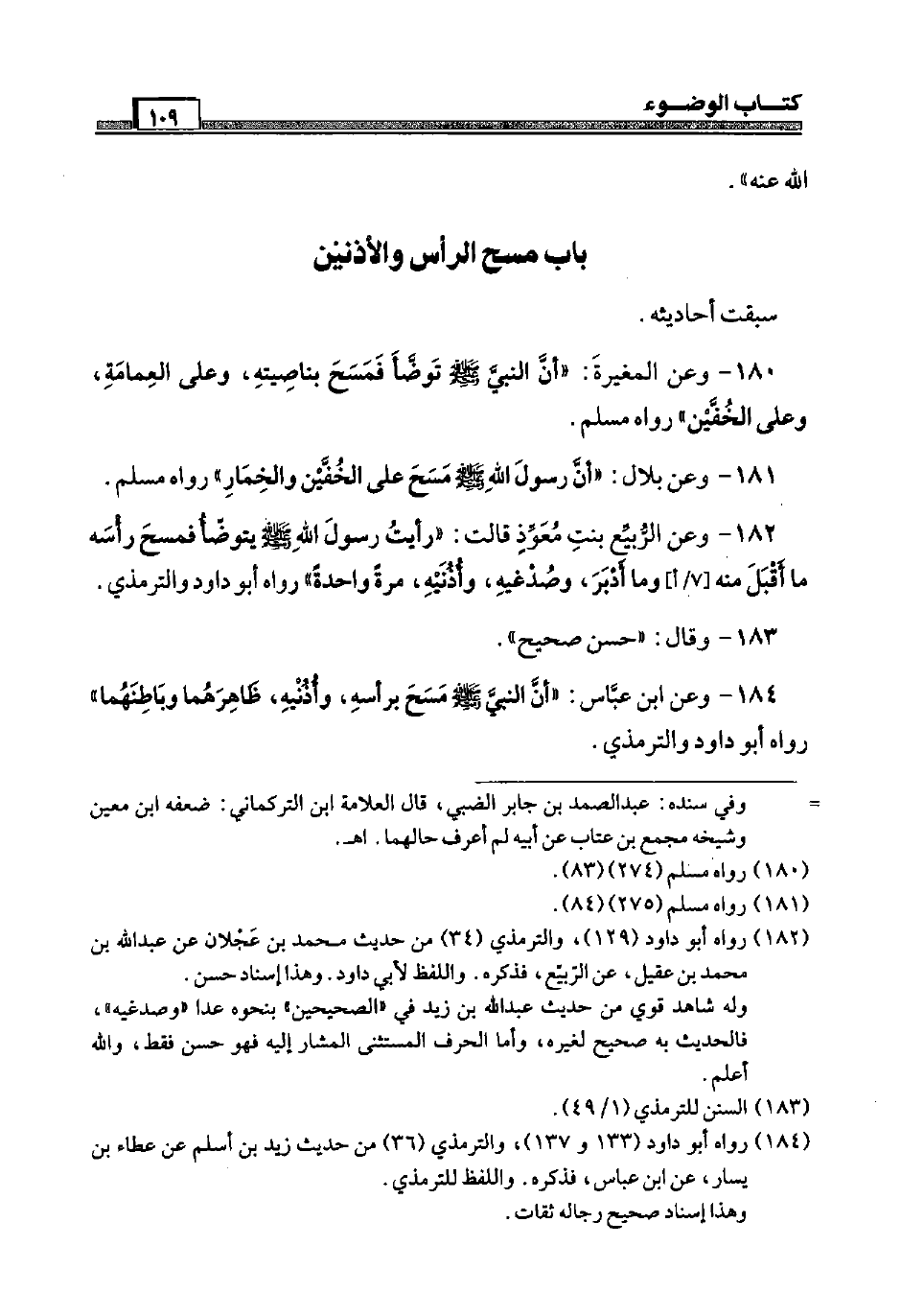 182 - وَعَن الربيِّع بنت معوِّذ قَالَت: " رَأَيْت رَسُول الله صَلَّى اللَّهُ عَلَيْهِ وَسَلَّم َ يتَوَضَّأ فَمسح رَأسه مَا أقبل مِنْهُ [7 / أ] وَمَا أدبر، وصدغيه، وَأُذُنَيْهِ، مرّة وَاحِدَة " رَوَاهُ أَبُو دَاوُد وَالتِّرْمِذِيّ.