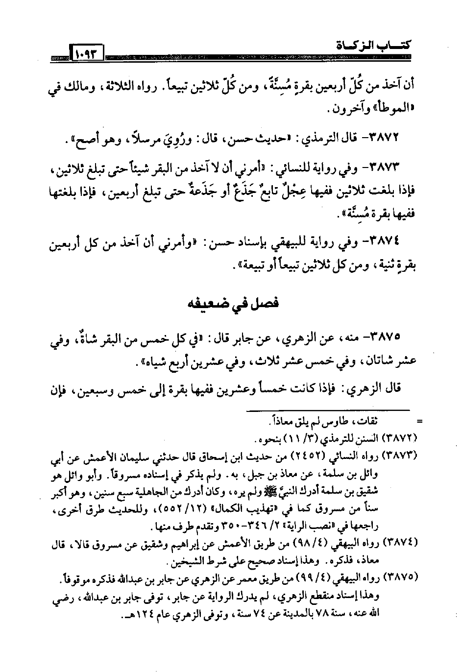3875 - مِنْهُ، عَن الزُّهْرِيّ، عَن جَابر قَالَ: " فِي كل خمس من الْبَقر شَاة، وَفِي عشر شَاتَان، وَفِي خمس عشر ثَلَاث، وَفِي عشْرين أَربع شِيَاه ". قَالَ الزُّهْرِيّ: فَإِذا كَانَت خمْسا وَعشْرين فَفِيهَا بقرة إِلَى خمس وَسبعين، فَإِن
