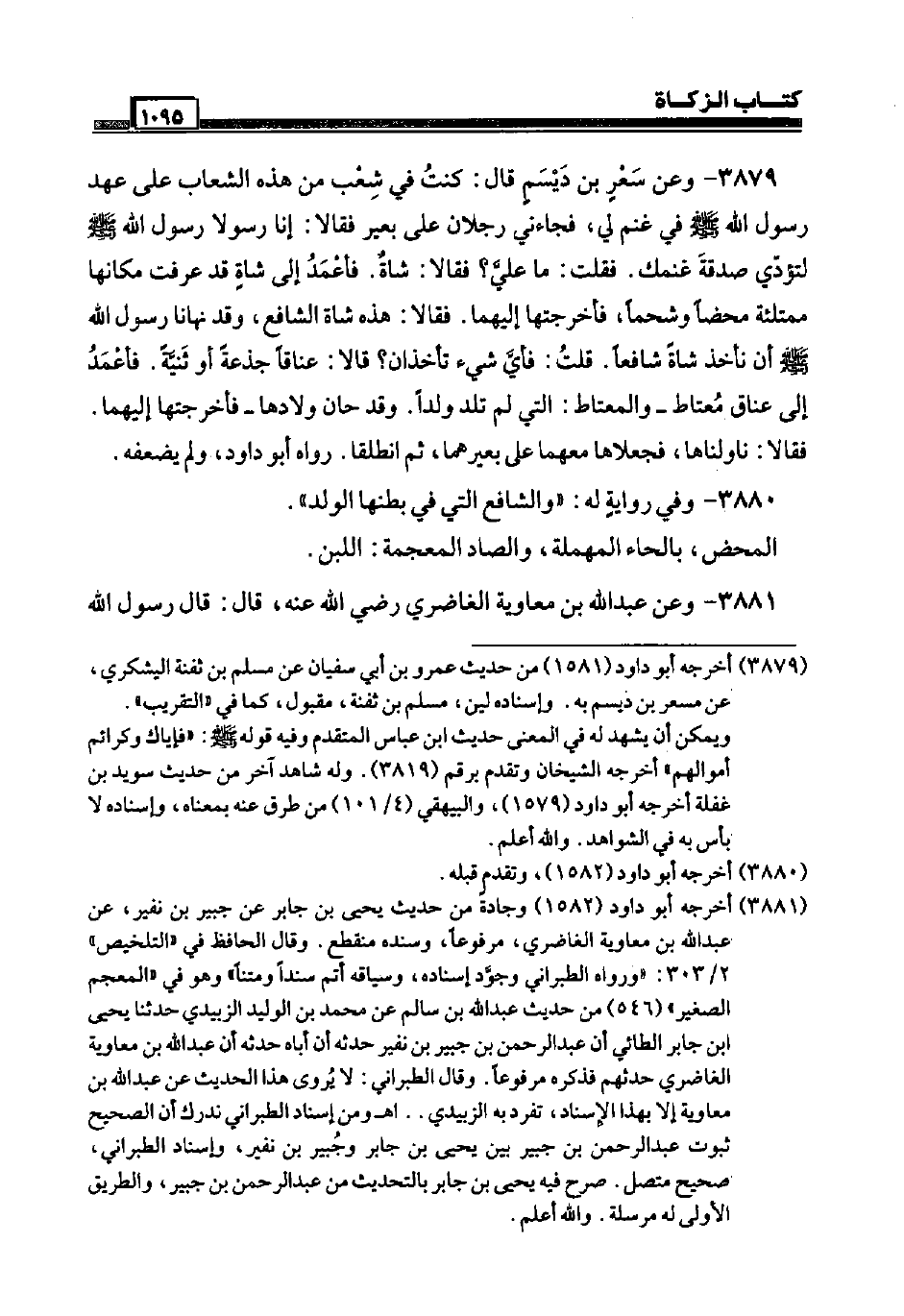 3879 - وَعَن سعر بن ديسم قَالَ: كنت فِي شعب من هَذِه الشعاب عَلَى عهد رَسُول الله صَلَّى اللَّهُ عَلَيْهِ وَسَلَّم َ فِي غنم لي، فَجَاءَنِي رجلَانِ عَلَى بعير فَقَالَا: إِنَّا رَسُولا رَسُول الله صَلَّى اللَّهُ عَلَيْهِ وَسَلَّم َ لتؤدي صَدَقَة غنمك. فَقلت: مَا عَلّي؟ فَقَالَا: شَاة. فأعمد إِلَى شَاة قد عرفت مَكَانهَا ممتلئة مَحْضا وشحما، فأخرجتها إِلَيْهِمَا. فَقَالَا: هَذِه شَاة الشافع، وَقد نَهَانَا رَسُول الله صَلَّى اللَّهُ عَلَيْهِ وَسَلَّم َ أَن نَأْخُذ شَاة شافعا. قلت: فَأَي شَيْء تأخذان؟ قَالَا: عنَاقًا جَذَعَة أَو ثنية. فأعمد إِلَى عنَاق معتاط - والمعتاط: الَّتِي لم تَلد ولدا. وَقد حَان ولادها - فأخرجتها إِلَيْهِمَا. فَقَالَا: ناولناها، فَجَعَلَاهَا مَعَهُمَا عَلَى بعيرهما، ثمَّ انْطَلقَا. رَوَاهُ أَبُو دَاوُد، وَلم يُضعفهُ.