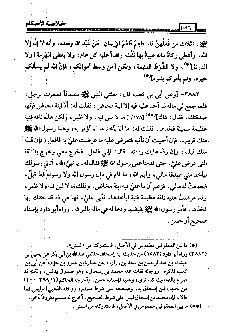3882 -[وَعَن أبي بن كَعْب قَالَ: بَعَثَنِي النَّبِي صَلَّى اللَّهُ عَلَيْهِ وَسَلَّم َ مُصدقا فمررت بِرَجُل، فَلَمَّا جمع لي مَاله لم أجد عَلَيْهِ فِيهِ إِلَّا ابْنة مَخَاض، فَقلت لَهُ: أد ابْنة مَخَاض فَإِنَّهَا صدقتك، فَقَالَ: ذَاك] [178 / أ] مَا لَا لبن فِيهِ، وَلَا ظهر، وَلَكِن هَذِه نَاقَة فتية عَظِيمَة سَمِينَة فَخذهَا. فَقلت لَهُ: مَا أَنا بآخذ مَا لم أُؤمر بِهِ، وَهَذَا رَسُول الله صَلَّى اللَّهُ عَلَيْهِ وَسَلَّم َ مِنْك قريب، فَإِن أَحْبَبْت أَن تَأتيه فتعرض عَلَيْهِ مَا عرضت عَلّي بِهِ فافعل، فَإِن قبله مِنْك قبلته، وَإِن رده عَلَيْك رَددته. قَالَ: فَإِنِّي فَاعل. فَخرج معي وَخرج بالناقة الَّتِي عرض عَلّي، حَتَّى قدمنَا عَلَى رَسُول الله صَلَّى اللَّهُ عَلَيْهِ وَسَلَّم َ فَقَالَ لَهُ: يَا نَبِي الله، أَتَانِي رَسُولك ليَأْخُذ مني صَدَقَة مَالِي، وأيم الله، مَا قَامَ فِي مَال رَسُول الله وَلَا رَسُوله قطّ قبل، فَجمعت لَهُ مَالِي، فَزعم أَن مَا عَلّي فِيهِ ابْنة مَخَاض، وَذَلِكَ مَا لَا لبن فِيهِ وَلَا ظهر، وَقد عرضت عَلَيْهِ نَاقَة عَظِيمَة فتية ليأخذها، فَأَبَى عَلّي، فها هِيَ ذه قد جئْتُك بهَا فَخذهَا، فَأمر رَسُول الله صَلَّى اللَّهُ عَلَيْهِ وَسَلَّم َ بقبضها ودعا لَهُ فِي مَاله بِالْبركَةِ. رَوَاهُ أَبُو دَاوُد بِإِسْنَاد صَحِيح أَو حسن
