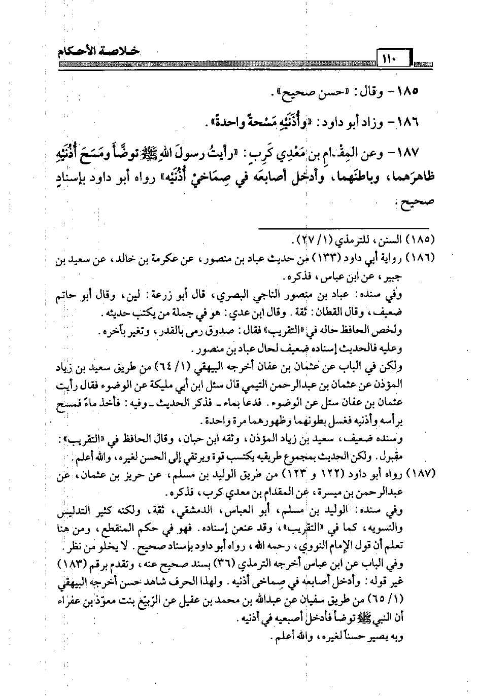 187 - وَعَن الْمِقْدَام بن معدي كرب: " رَأَيْت رَسُول الله صَلَّى اللَّهُ عَلَيْهِ وَسَلَّم َ تَوَضَّأ وَمسح أُذُنَيْهِ ظاهرهما، وباطنهما، وَأدْخل أَصَابِعه فِي صماخي أُذُنَيْهِ " رَوَاهُ أَبُو دَاوُد بِإِسْنَاد صَحِيح.
