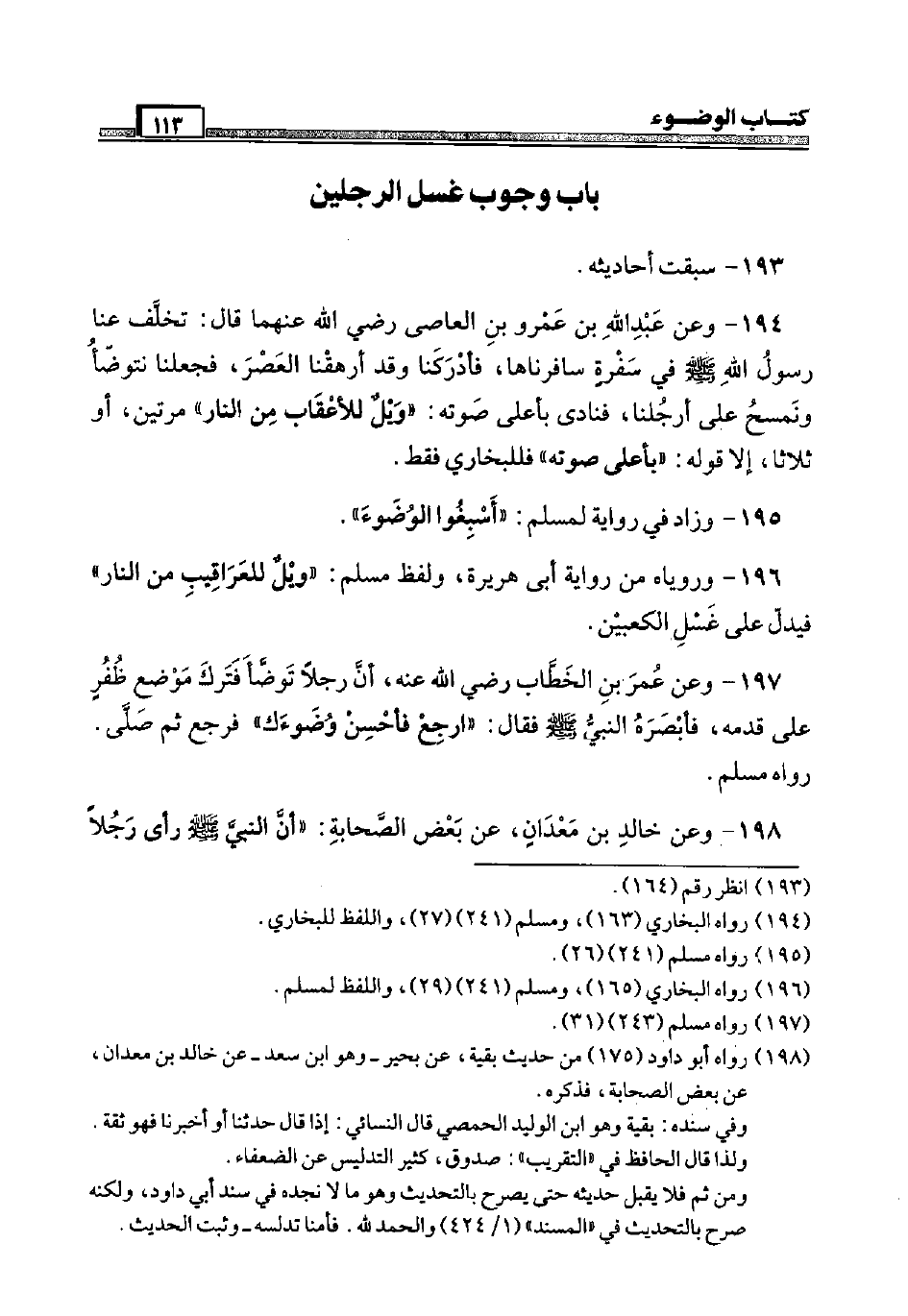 194 - وَعَن عبد الله بن عَمْرو بن العَاصِي رَضِيَ اللَّهُ عَنْهما قَالَ: تخلف عَنَّا رَسُول الله صَلَّى اللَّهُ عَلَيْهِ وَسَلَّم َ فِي سفرة سافرناها، فَأَدْرَكنَا وَقد أَرْهقنَا الْعَصْر، فَجعلنَا نَتَوَضَّأ وَنَمْسَح عَلَى أَرْجُلنَا، فَنَادَى بِأَعْلَى صَوته: " ويل لِلْأَعْقَابِ من النَّار " مرَّتَيْنِ، أَو ثَلَاثًا، إِلَّا قَوْله: " بِأَعْلَى صَوته " فللبخاري فَقَط.