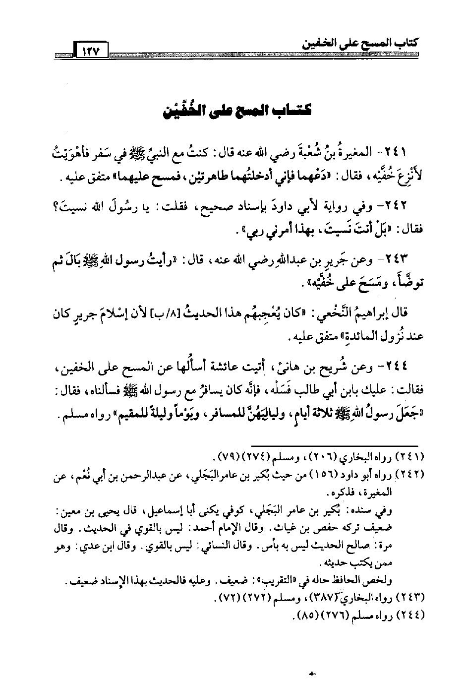 241 - الْمُغيرَة بن شُعْبَة رَضِيَ اللَّهُ عَنْه قَالَ: كنت مَعَ النَّبِي صَلَّى اللَّهُ عَلَيْهِ وَسَلَّم َ فِي سفر فَأَهْوَيْت لأنزع خفيه، فَقَالَ: " دعهما فَإِنِّي أدخلتهما طاهرتين، فَمسح عَلَيْهِمَا " مُتَّفق عَلَيْهِ.