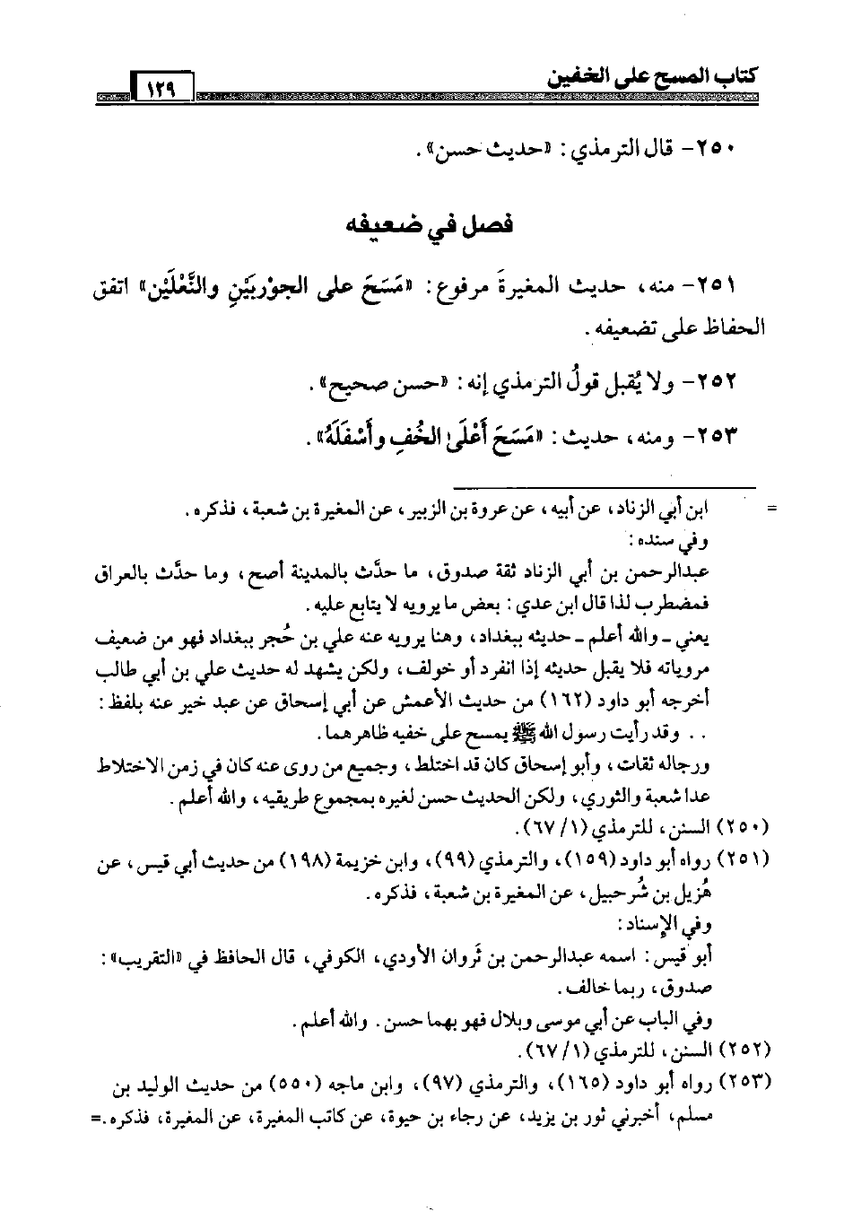251 - مِنْهُ، حَدِيث الْمُغيرَة مَرْفُوع: " مسح عَلَى الجوربين والنعلين " اتّفق الْحفاظ عَلَى تَضْعِيفه.