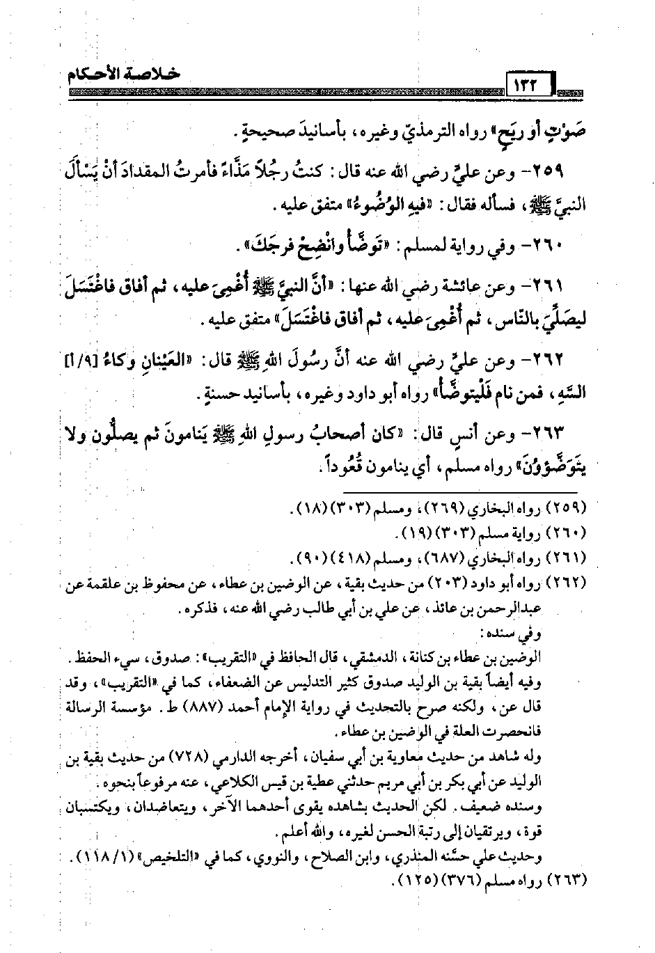262 - وَعَن عَلّي رَضِيَ اللَّهُ عَنْه أَن رَسُول الله صَلَّى اللَّهُ عَلَيْهِ وَسَلَّم َ قَالَ: " العينان وكاء [9 / أ] السه، فَمن نَام فَليَتَوَضَّأ " رَوَاهُ أَبُو دَاوُد وَغَيره، بأسانيد حَسَنَة.