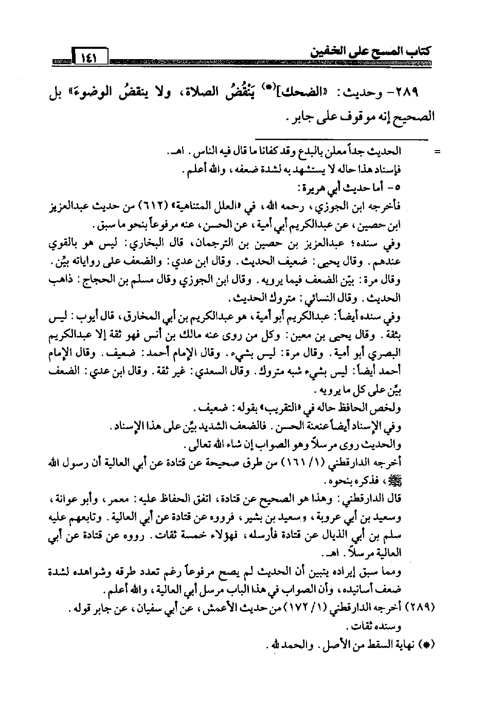 289 - وَحَدِيث: " الضحك] ينْقض الصَّلَاة، وَلَا ينْقض الْوضُوء " بل الصَّحِيح إِنَّه مَوْقُوف عَلَى جَابر.