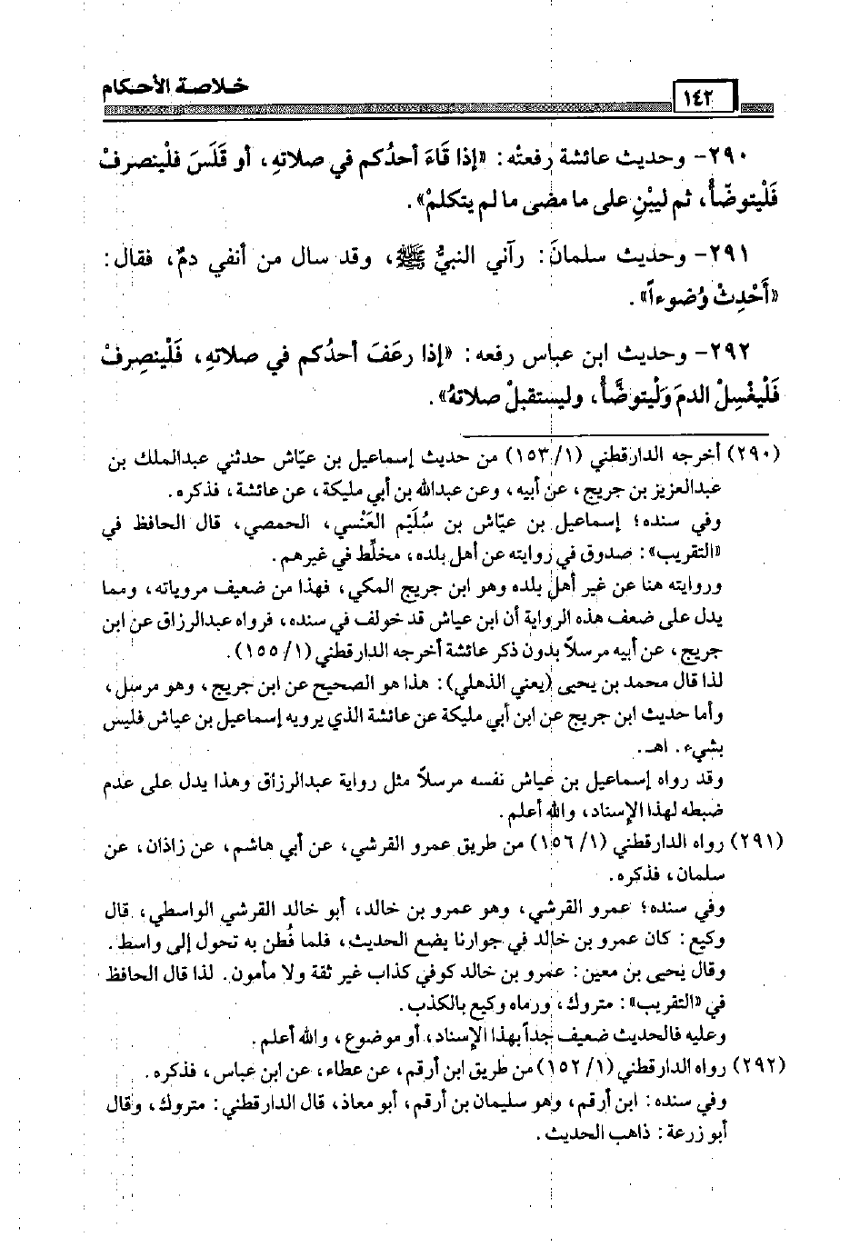 292 - وَحَدِيث ابْن عَبَّاس رَفعه: " إِذا رعف أحدكُم فِي صلَاته، فلينصرف فليغسل الدَّم وليتوضأ، وليستقبل صلَاته ".