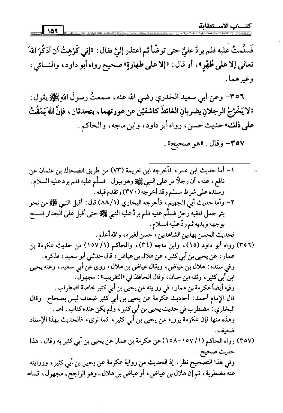 فَسلمت عَلَيْهِ فَلم يرد عَلّي حَتَّى تَوَضَّأ ثمَّ اعتذر إِلَيّ فَقَالَ: " إِنِّي كرهت أَن أذكر الله تَعَالَى إِلَّا عَلَى طهر "، أَو قَالَ: " إِلَّا عَلَى طَهَارَة " صَحِيح رَوَاهُ أَبُو دَاوُد، وَالنَّسَائِيّ، وَغَيرهمَا.