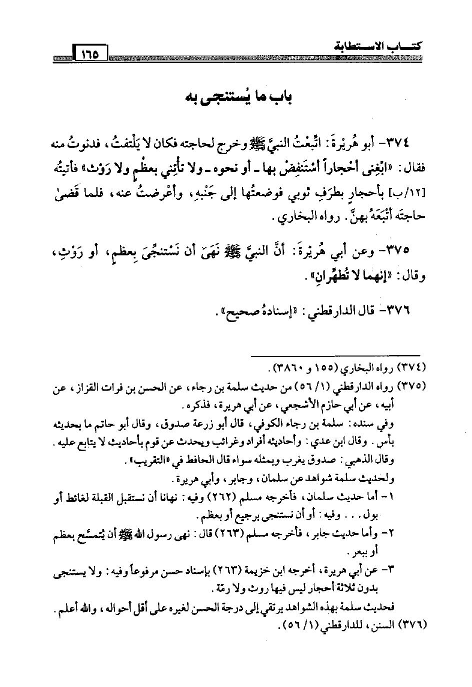 374 - أَبُو هُرَيْرَة: اتبعت النَّبِي صَلَّى اللَّهُ عَلَيْهِ وَسَلَّم َ وَخرج لِحَاجَتِهِ فَكَانَ لَا يلْتَفت، فدنوت مِنْهُ فَقَالَ: " ابغني أحجارا أستنفض بهَا - أَو نَحوه - وَلَا تأتني بِعظم وَلَا رَوْث " فَأَتَيْته [12 / ب] بأحجار بِطرف ثوبي فَوَضَعتهَا إِلَى جنبه، وأعرضت عَنهُ، فَلَمَّا قَضَى حَاجته أتبعه بِهن. رَوَاهُ البُخَارِيّ.