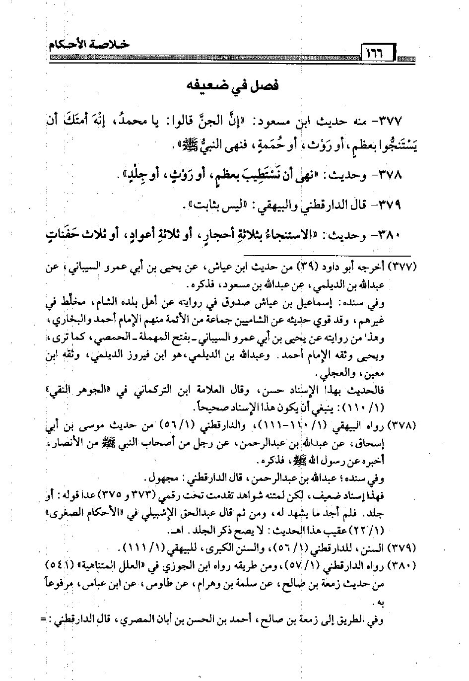 377 - مِنْهُ حَدِيث ابْن مَسْعُود: " إِن الْجِنّ قَالُوا: يَا مُحَمَّد، إنْه أمتك أَن يستنجوا بِعظم، أَو رَوْث، أَو حُممة، فَنَهَى النَّبِي صَلَّى اللَّهُ عَلَيْهِ وَسَلَّم َ ".