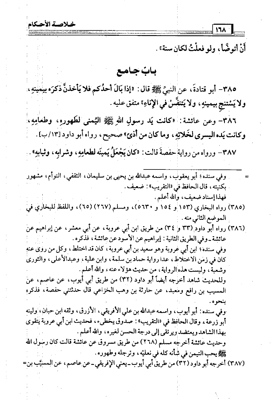 385 - أَبُو قَتَادَة، عَن النَّبِي صَلَّى اللَّهُ عَلَيْهِ وَسَلَّم َ قَالَ: " إِذا بَال أحدكُم فَلَا يَأْخُذن ذكره بِيَمِينِهِ، وَلَا يسْتَنْج بِيَمِينِهِ، وَلَا يتنفس فِي الْإِنَاء " مُتَّفق عَلَيْهِ.
