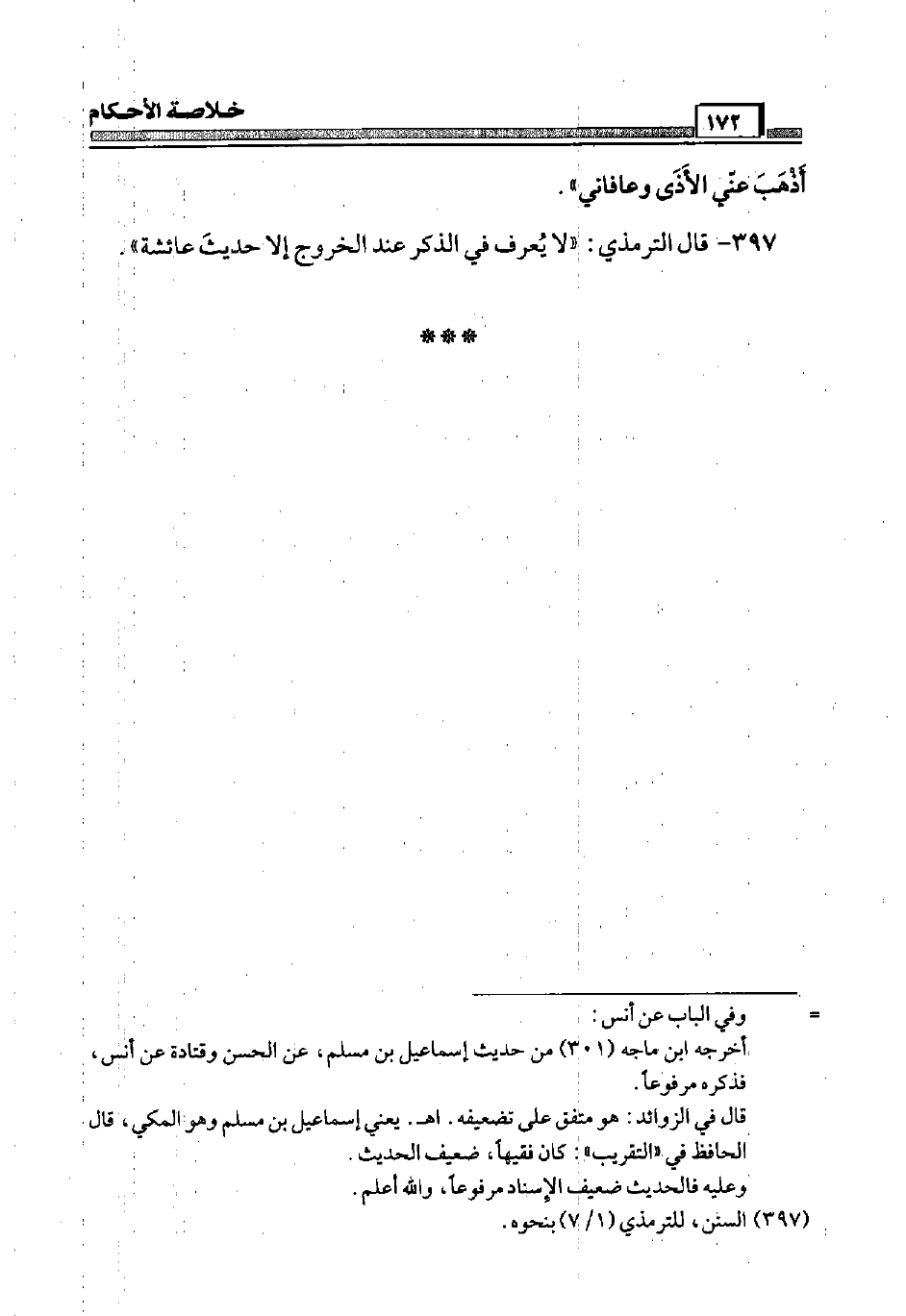 397 - قَالَ التِّرْمِذِيّ: " لَا يُعرف فِي الذّكر عِنْد الْخُرُوج إِلَّا حَدِيث عَائِشَة ".