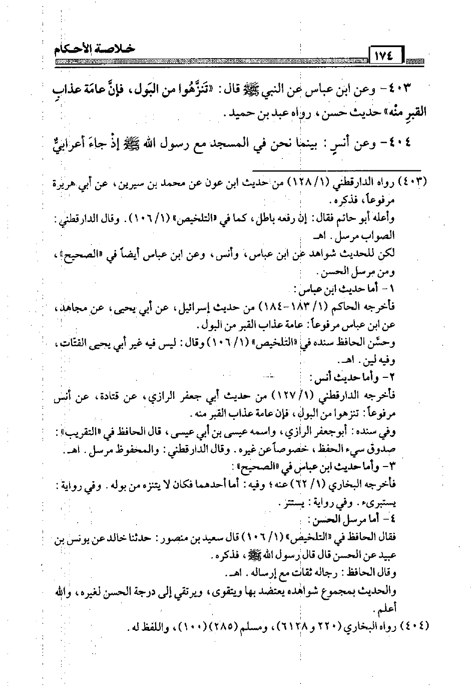 403 - وَعَن ابْن عَبَّاس عَن النَّبِي صَلَّى اللَّهُ عَلَيْهِ وَسَلَّم َ قَالَ: " تنزَّهوا من الْبَوْل، فَإِن عَامَّة عَذَاب الْقَبْر مِنْهُ " حَدِيث حسن، رَوَاهُ عبد بن حميد.
