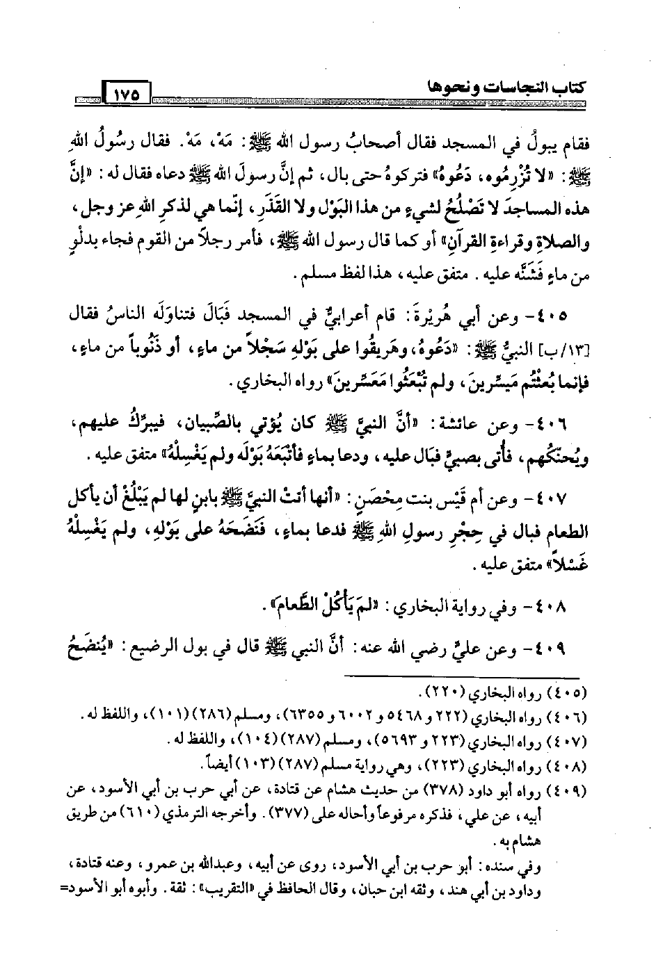 405 - وَعَن أبي هُرَيْرَة: قَامَ أَعْرَابِي فِي الْمَسْجِد فَبَال فتناوله النَّاس فَقَالَ [13 / ب] النَّبِي صَلَّى اللَّهُ عَلَيْهِ وَسَلَّم َ: " دَعوه، وهريقوا عَلَى بَوْله سَجْلا من مَاء، أَو ذَنوبا من مَاء، فَإِنَّمَا بُعثتم ميسِّرين، وَلم تُبعثوا معسرين " رَوَاهُ البُخَارِيّ.