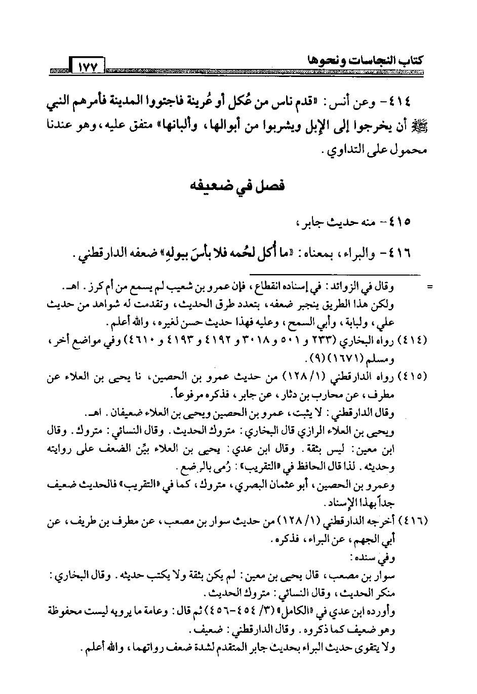 416 - والبراء، بِمَعْنَاهُ: " مَا أُكل لَحْمه فَلَا بَأْس ببوله " ضعفه الدَّارَقُطْنِيّ.