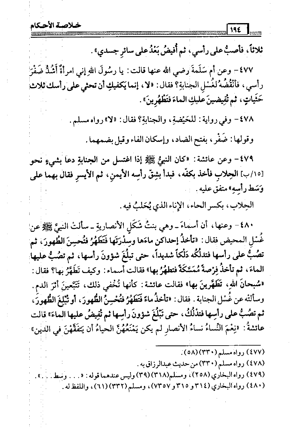 478 - وَفِي رِوَايَة: للحيضة، والجنابة؟ فَقَالَ: " لَا " رَوَاهُ مُسلم. وَقَوْلها: ضفر، بِفَتْح الضَّاد، وَإِسْكَان الْفَاء وَقيل بضمهما.