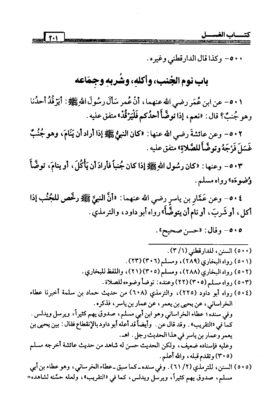 501 - عَن ابْن عمر رَضِيَ اللَّهُ عَنْهما، أَن عمر سَأَلَ رَسُول الله صَلَّى اللَّهُ عَلَيْهِ وَسَلَّم َ: أيرقد أَحَدنَا وَهُوَ جنب؟ قَالَ: " نعم، إِذا تَوَضَّأ أحدكُم فليرقد " مُتَّفق عَلَيْهِ.