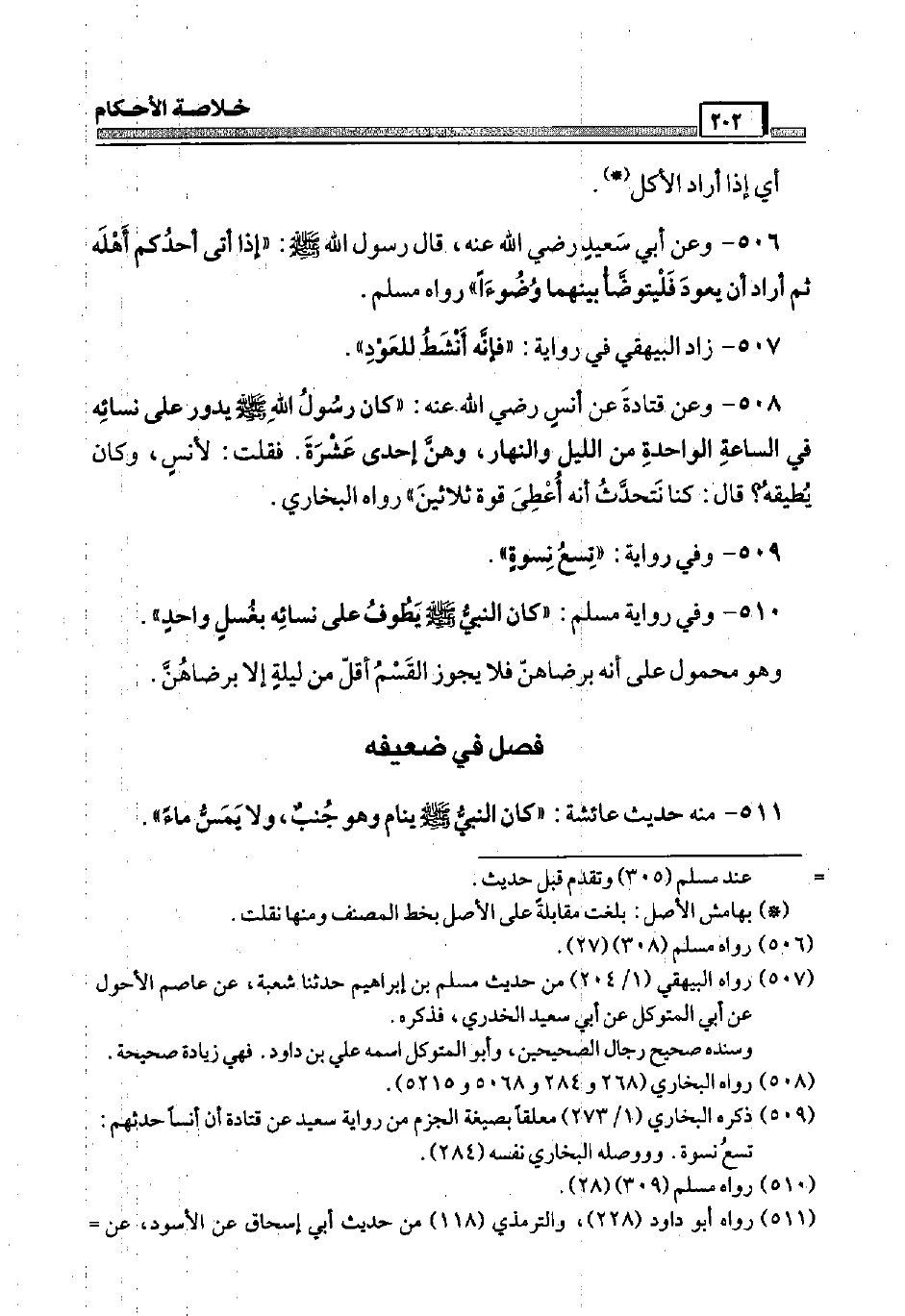 508 - وَعَن قَتَادَة عَن أنس رَضِيَ اللَّهُ عَنْه: " كَانَ رَسُول الله صَلَّى اللَّهُ عَلَيْهِ وَسَلَّم َ يَدُور عَلَى نِسَائِهِ فِي السَّاعَة الْوَاحِدَة من اللَّيْل وَالنَّهَار، وَهن إِحْدَى عشرَة. فَقلت: لأنس، وَكَانَ يطيقه؟ قَالَ: كُنَّا نتحدث أَنه أعطي قُوَّة ثَلَاثِينَ " رَوَاهُ البُخَارِيّ.