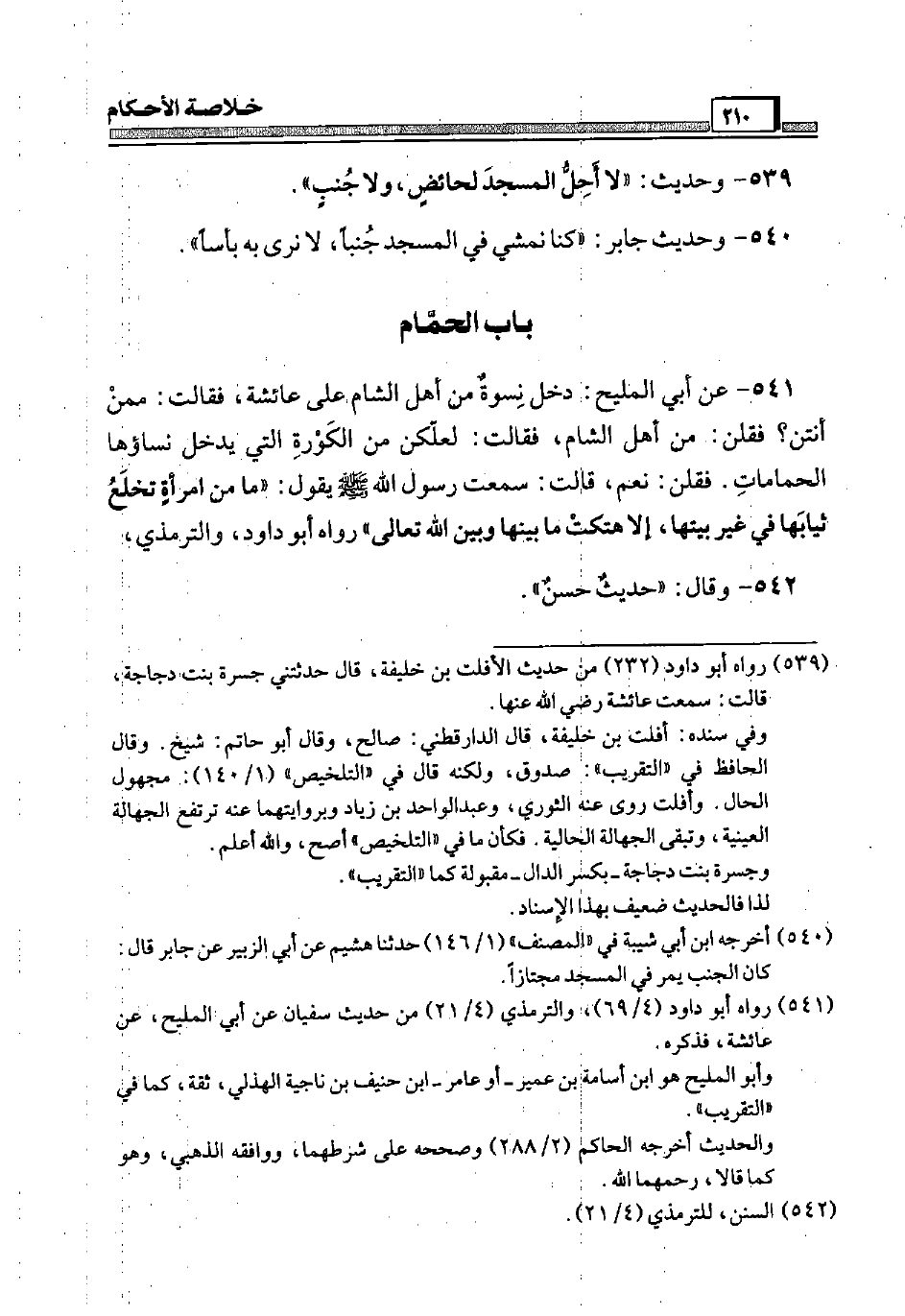 541 - عَن أبي الْمليح: دخل نسْوَة من أهل الشَّام عَلَى عَائِشَة، فَقَالَت: مِمَّن أنتن؟ فَقُلْنَ: من أهل الشَّام، فَقَالَت: لعلكن من الكورة الَّتِي يدْخل نساؤها الحمامات. فَقُلْنَ: نعم، قَالَت: سَمِعت رَسُول الله صَلَّى اللَّهُ عَلَيْهِ وَسَلَّم َ يَقُول: " مَا من امْرَأَة تخلع ثِيَابهَا فِي غير بَيتهَا، إِلَّا هتكت مَا بَينهَا وَبَين الله تَعَالَى " رَوَاهُ أَبُو دَاوُد، وَالتِّرْمِذِيّ،