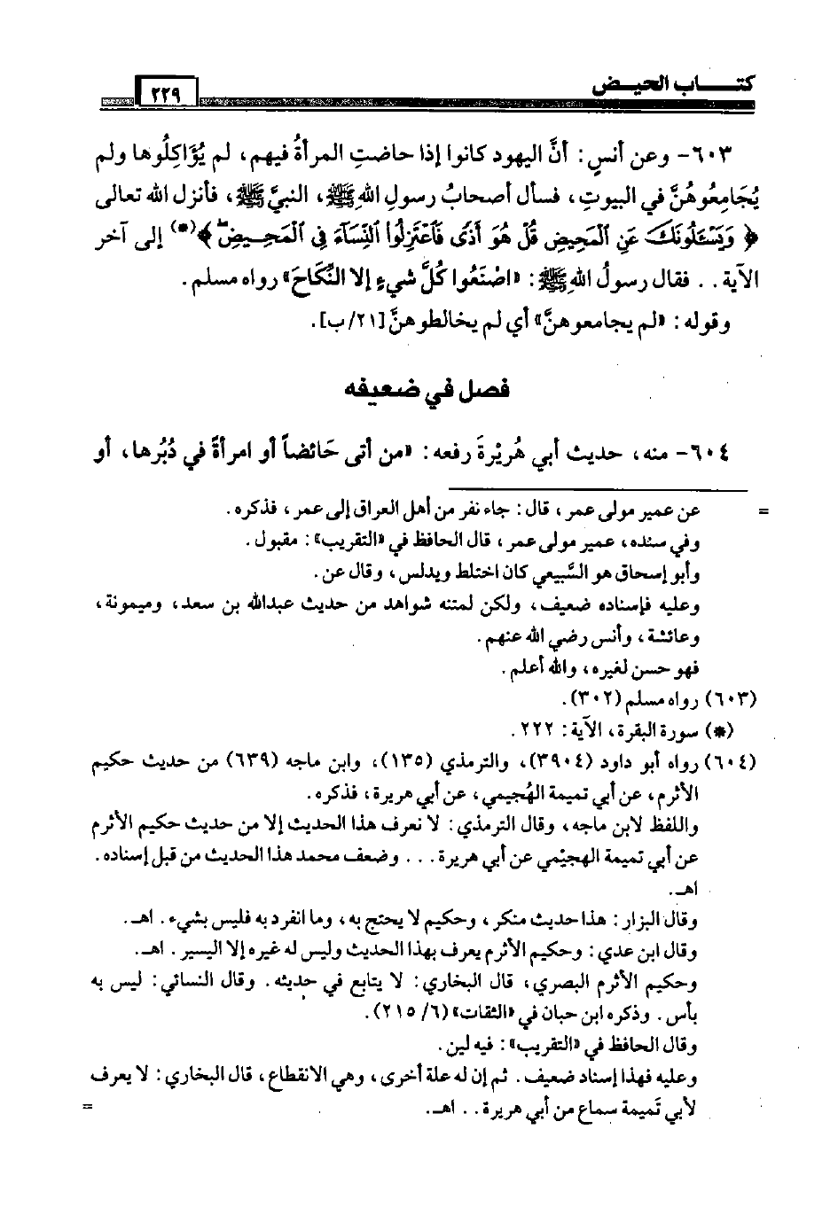 603 - وَعَن أنس: أَن الْيَهُود كَانُوا إِذا حَاضَت الْمَرْأَة فيهم، لم يؤاكلوها وَلم يجامعوهن فِي الْبيُوت، فَسَأَلَ أَصْحَاب رَسُول الله صَلَّى اللَّهُ عَلَيْهِ وَسَلَّم َ، النَّبِي صَلَّى اللَّهُ عَلَيْهِ وَسَلَّم َ، فَأنْزل الله تَعَالَى (ويسئلونك عَن الْمَحِيض قل هُوَ أَذَى فاعتزلوا النِّسَاء فِي الْمَحِيض) إِلَى آخر الْآيَة. . فَقَالَ رَسُول الله صَلَّى اللَّهُ عَلَيْهِ وَسَلَّم َ: " اصنعوا كل شَيْء إِلَّا النِّكَاح " رَوَاهُ مُسلم. وَقَوله: " لم يجامعوهن " أَي لم يخالطوهن [21 / ب] .