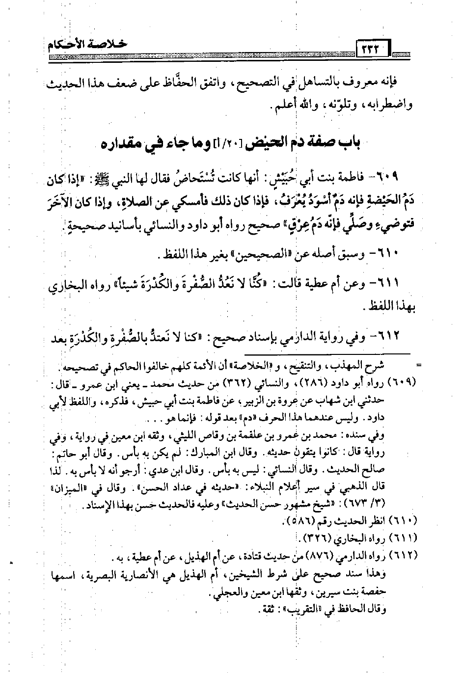 609 - فَاطِمَة بنت أبي حُبَيْش: أَنَّهَا كَانَت تستحاض فَقَالَ لَهَا النَّبِي صَلَّى اللَّهُ عَلَيْهِ وَسَلَّم َ: " إِذا كَانَ دم الْحَيْضَة فَإِنَّهُ دم أسود يُعرف، فَإِذا كَانَ ذَلِك فأمسكي عَن الصَّلَاة، وَإِذا كَانَ الآخر فتوضئي وَصلي فَإِنَّهُ دم عِرْق " صَحِيح رَوَاهُ أَبُو دَاوُد وَالنَّسَائِيّ بأسانيد صَحِيحَة.