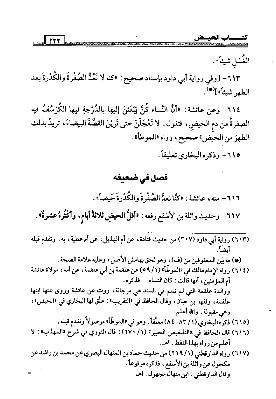 616 - مِنْهُ، عَائِشَة: " كُنَّا نعد الصُّفْرَة والكدرة حيضا ".