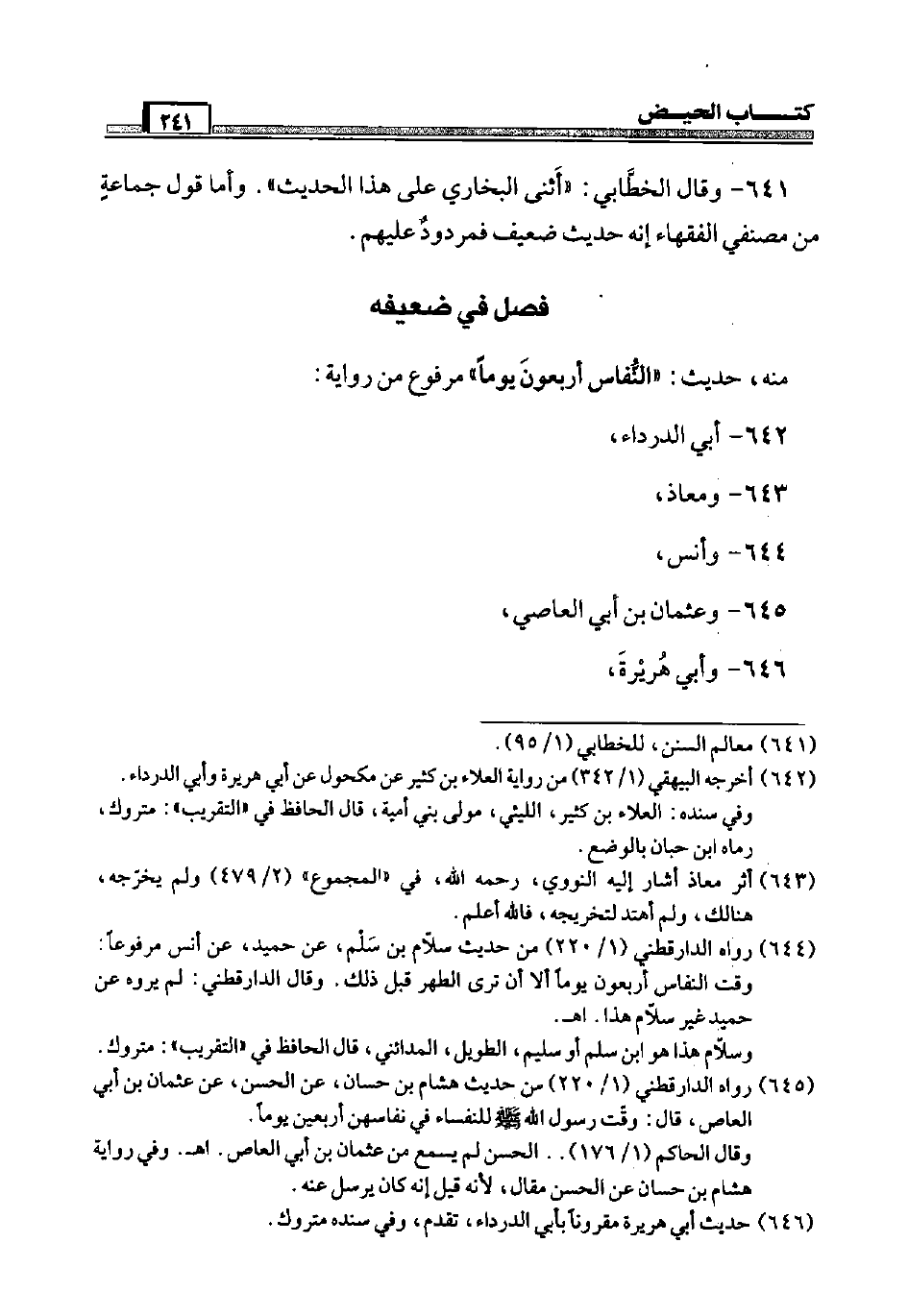 641 - وَقَالَ الْخطابِيّ: " أَثْنَى البُخَارِيّ عَلَى هَذَا الحَدِيث ". وَأما قَول جمَاعَة من مصنفي الْفُقَهَاء إِنَّه حَدِيث ضَعِيف فمردود عَلَيْهِم.