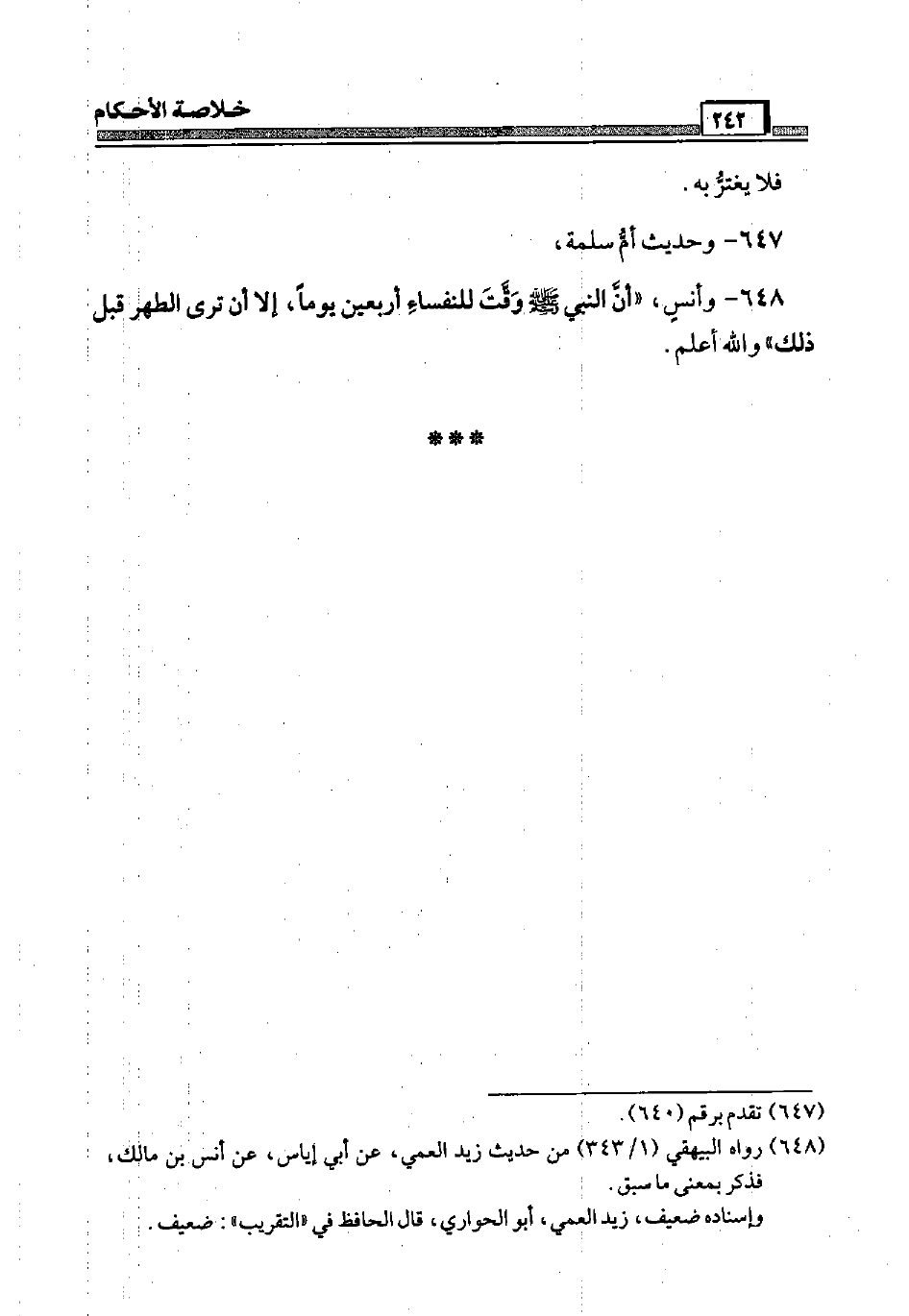 648 - وَأنس، " أَن النَّبِي صَلَّى اللَّهُ عَلَيْهِ وَسَلَّم َ وَقت للنفساء أَرْبَعِينَ يَوْمًا، إِلَّا أَن ترَى الطُّهْر قبل ذَلِك " وَالله أعلم.