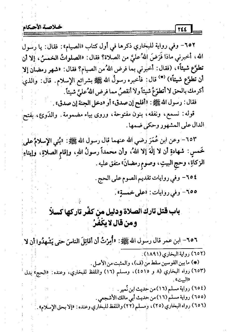 653 - وَعَن ابْن عمر رَضِيَ اللَّهُ عَنْهما قَالَ رَسُول الله صَلَّى اللَّهُ عَلَيْهِ وَسَلَّم َ: " بُني الْإِسْلَام عَلَى خمس: شَهَادَة أَن لَا إِلَه إِلَّا الله، وَأَن مُحَمَّدًا رَسُول الله، وإقام الصَّلَاة، وإيتاء الزَّكَاة، وَحج الْبَيْت، وَصَوْم رَمَضَان " مُتَّفق عَلَيْهِ.