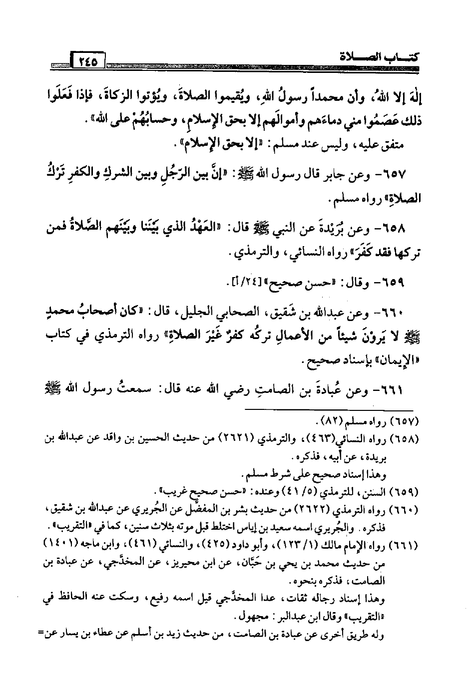 660 - وَعَن عبد الله بن شَقِيق، الصَّحَابِيّ الْجَلِيل، قَالَ: " كَانَ أَصْحَاب مُحَمَّد صَلَّى اللَّهُ عَلَيْهِ وَسَلَّم َ لَا يرَوْنَ شَيْئا من الْأَعْمَال تَركه كفر غير الصَّلَاة " رَوَاهُ التِّرْمِذِيّ فِي كتاب " الْإِيمَان " بِإِسْنَاد صَحِيح.