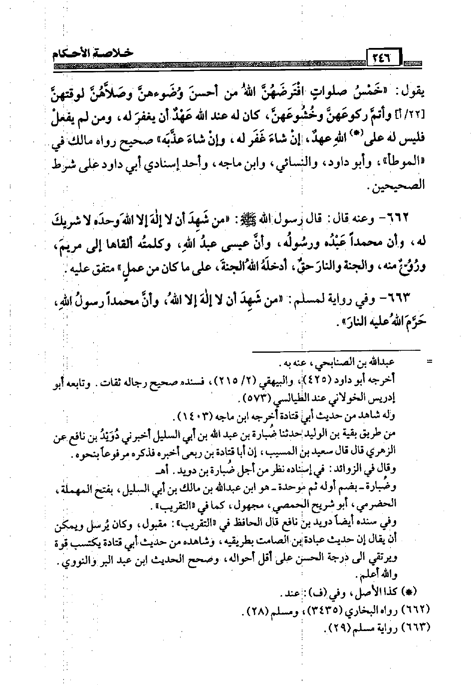 يَقُول: " خمس صلوَات افترضهن الله من أحسن وضوءهن وصلاهن لوقتهن [22 / أ] وَأتم ركوعهن وخشوعهن، كَانَ لَهُ عِنْد الله عهد أَن يغْفر لَهُ، وَمن لم يفعل فَلَيْسَ لَهُ عَلَى الله عهد، إِن شَاءَ غفر لَهُ، وَإِن شَاءَ عذبه " صَحِيح رَوَاهُ مَالك فِي " الْمُوَطَّأ " وَأَبُو دَاوُد، وَالنَّسَائِيّ، وَابْن مَاجَه، وَأحد إسنادي أبي دَاوُد عَلَى شَرط الصَّحِيحَيْنِ.