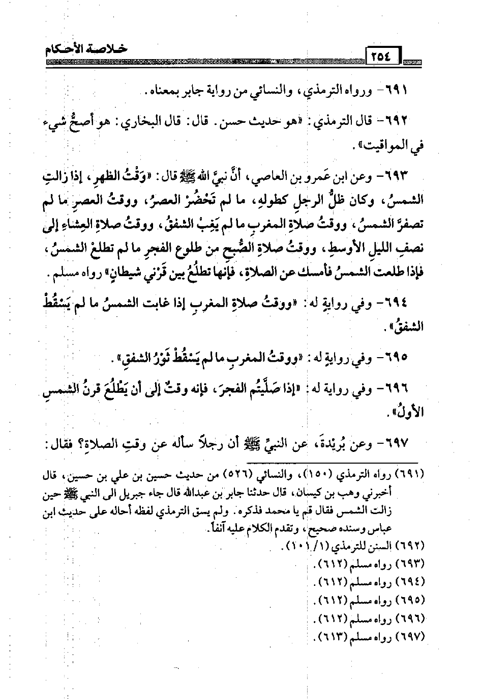 693 - وَعَن ابْن عَمْرو بن العَاصِي، أَن نَبِي الله صَلَّى اللَّهُ عَلَيْهِ وَسَلَّم َ قَالَ: " وَقت الظّهْر، إِذا زَالَت الشَّمْس، وَكَانَ ظلّ الرجل كَطُولِهِ، مَا لم تحضر الْعَصْر، وَوقت الْعَصْر مَا لم تصفر الشَّمْس، وَوقت صَلَاة الْمغرب مَا لم يغب الشَّفق، وَوقت صَلَاة الْعشَاء إِلَى نصف اللَّيْل الْأَوْسَط، وَوقت صَلَاة الصُّبْح من طُلُوع الْفجْر مَا لم تطلع الشَّمْس، فَإِذا طلعت الشَّمْس فَأمْسك عَن الصَّلَاة، فَإِنَّهَا تطلع بَين قَرْني شَيْطَان " رَوَاهُ مُسلم.