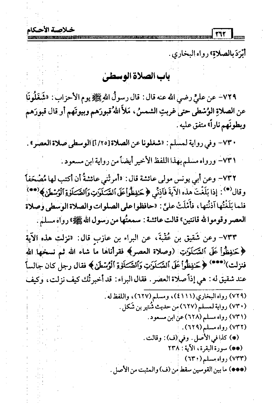 732 - وَعَن أبي يُونُس مولَى عَائِشَة قَالَ: " أَمرتنِي عَائِشَة أَن أكتب لَهَا مُصحفا وَقَالَ: إِذا بلغت هَذِه الْآيَة فَآذِنِّي {حَافظُوا عَلَى الصَّلَوَات وَالصَّلَاة الْوُسْطَى} فَلَمَّا بلغتهَا آذَنتهَا، فَأَمْلَتْ عَلّي: " حَافظُوا عَلَى الصَّلَوَات وَالصَّلَاة الْوُسْطَى وَصَلَاة الْعَصْر وَقومُوا لله قَانِتِينَ " قَالَت عَائِشَة: سَمعتهَا من رَسُول الله صَلَّى اللَّهُ عَلَيْهِ وَسَلَّم َ " رَوَاهُ مُسلم.