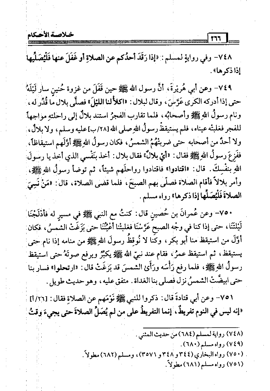 750 - وَعَن عمرَان بن حُصَيْن قَالَ: كنت مَعَ النَّبِي صَلَّى اللَّهُ عَلَيْهِ وَسَلَّم َ فِي مسير لَهُ فأدلجنا ليلتنا، حَتَّى إِذا كُنَّا فِي وَجه الصُّبْح عرسنا فغلبتنا أَعيننَا حَتَّى بزغت الشَّمْس، فَكَانَ أول من اسْتَيْقَظَ منا أَبُو بكر، وَكُنَّا لَا نوقظ رَسُول الله صَلَّى اللَّهُ عَلَيْهِ وَسَلَّم َ من مَنَامه إِذا نَام حَتَّى يَسْتَيْقِظ، ثمَّ اسْتَيْقَظَ عمر، فَقَامَ عِنْد نَبِي الله صَلَّى اللَّهُ عَلَيْهِ وَسَلَّم َ يكبر وَيرْفَع صَوته حَتَّى اسْتَيْقَظَ رَسُول الله صَلَّى اللَّهُ عَلَيْهِ وَسَلَّم َ، فَلَمَّا رفع رَأسه وَرَأَى الشَّمْس قد بزغت قَالَ: " ارتحلوا " فَسَار بِنَا حَتَّى ابْيَضَّتْ الشَّمْس نزل فَصَلى بِنَا الْغَدَاة. مُتَّفق عَلَيْهِ، وَهُوَ حَدِيث طَوِيل.