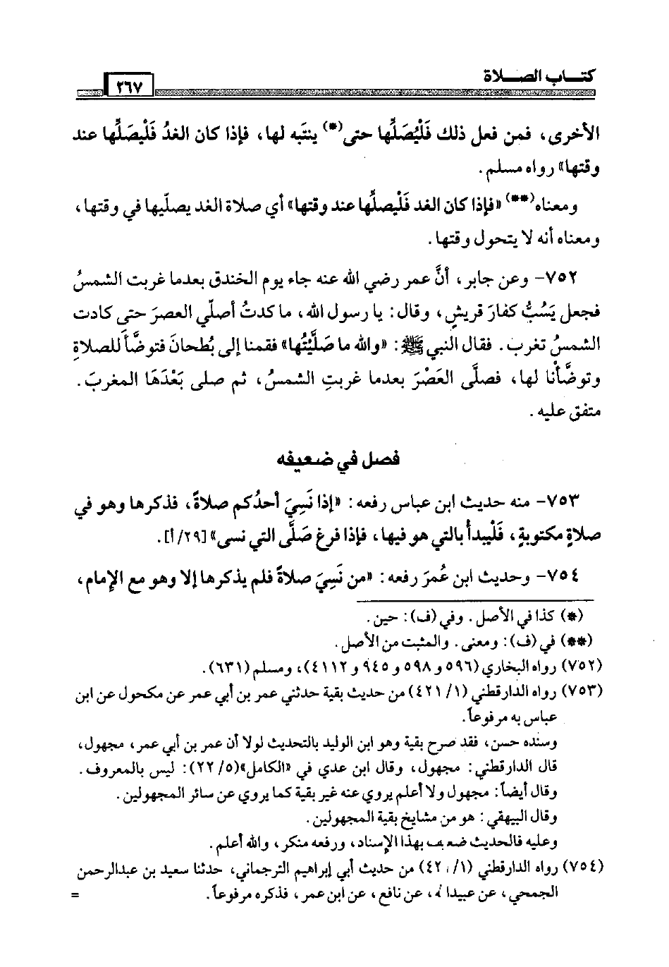 752 - وَعَن جَابر، أَن عمر رَضِيَ اللَّهُ عَنْه جَاءَ يَوْم الخَنْدَق بَعْدَمَا غربت الشَّمْس فَجعل يسب كفار قُرَيْش، وَقَالَ: يَا رَسُول الله، مَا كدت أُصَلِّي الْعَصْر حَتَّى كَادَت الشَّمْس تغرب. فَقَالَ النَّبِي صَلَّى اللَّهُ عَلَيْهِ وَسَلَّم َ: " وَالله مَا صليتها " فقمنا إِلَى بطحان فَتَوَضَّأ للصَّلَاة وتوضأنا لَهَا، فَصَلى الْعَصْر بَعْدَمَا غربت الشَّمْس، ثمَّ صَلَّى بعْدهَا الْمغرب. مُتَّفق عَلَيْهِ.