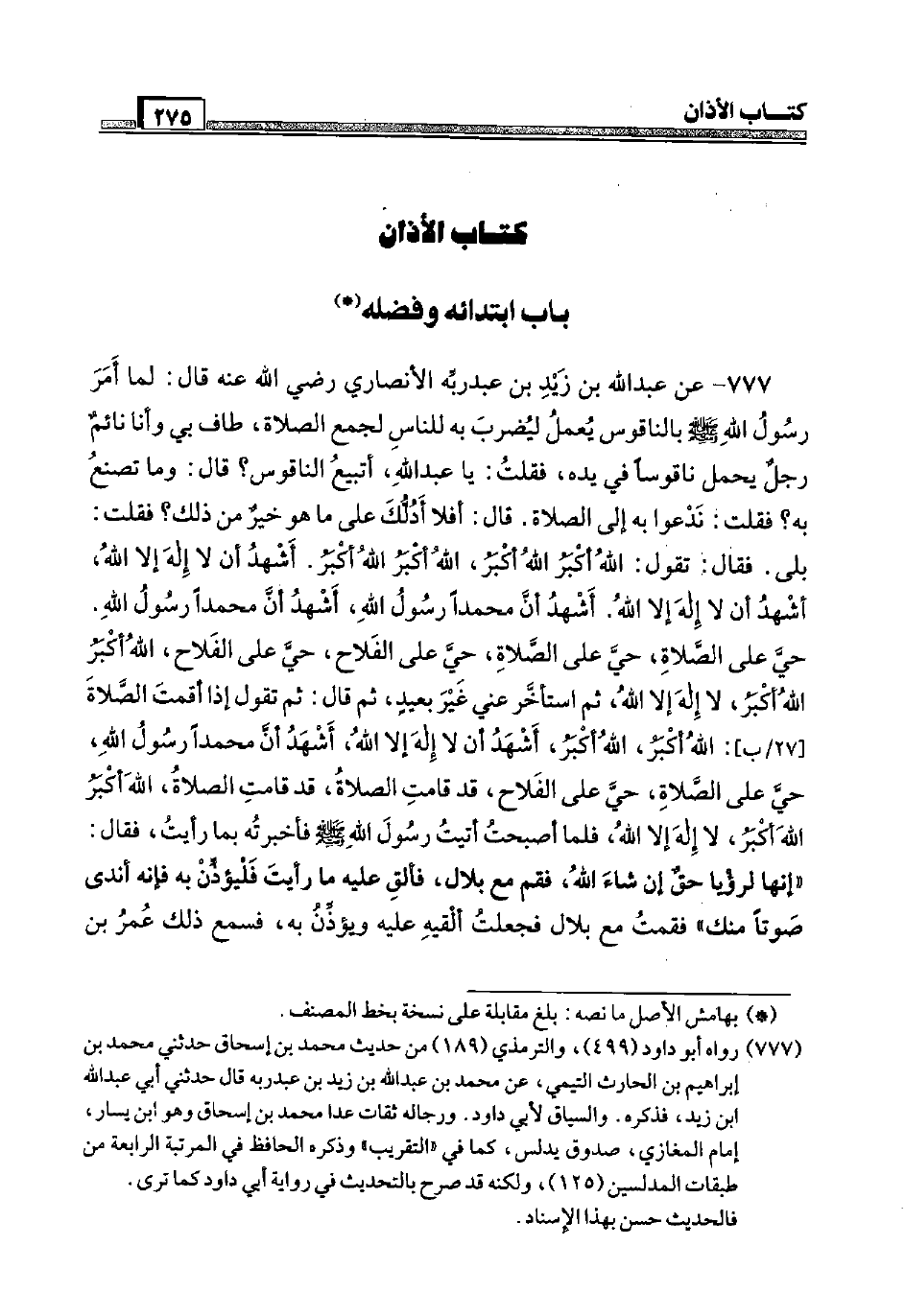 777 - عَن عبد الله بن زيد بن عبد ربه الْأنْصَارِيّ رَضِيَ اللَّهُ عَنْه قَالَ: لما أَمر رَسُول الله صَلَّى اللَّهُ عَلَيْهِ وَسَلَّم َ بالناقوس يعْمل ليضْرب بِهِ للنَّاس لجمع الصَّلَاة، طَاف بِي وَأَنا نَائِم رجل يحمل ناقوسا فِي يَده، فَقلت: يَا عبد الله، أتبيع الناقوس؟ قَالَ: وَمَا تصنع بِهِ؟ فَقلت: ندعوا بِهِ إِلَى الصَّلَاة. قَالَ: أَفلا أدلك عَلَى مَا هُوَ خير من ذَلِك؟ فَقلت: بلَى. فَقَالَ: تَقول: الله أكبر الله أكبر، الله أكبر الله أكبر. أشهد أَن لَا إِلَه إِلَّا الله، أشهد أَن لَا إِلَه إِلَّا الله. أشهد أَن مُحَمَّدًا رَسُول الله، أشهد أَن مُحَمَّدًا رَسُول الله. حَيّ عَلَى الصَّلَاة، حَيّ عَلَى الصَّلَاة، حَيّ عَلَى الْفَلاح، حَيّ عَلَى الْفَلاح، الله أكبر الله أكبر، لَا إِلَه إِلَّا الله، ثمَّ اسْتَأْخَرَ عني غير بعيد، ثمَّ قَالَ: ثمَّ تَقول إِذا أَقمت الصَّلَاة [27 / ب] : الله أكبر، الله أكبر، أشهد أَن لَا إِلَه إِلَّا الله، أشهد أَن مُحَمَّدًا رَسُول الله، حَيّ عَلَى الصَّلَاة، حَيّ عَلَى الْفَلاح، قد قَامَت الصَّلَاة، قد قَامَت الصَّلَاة، الله أكبر الله أكبر، لَا إِلَه إِلَّا الله، فَلَمَّا أَصبَحت أتيت رَسُول الله صَلَّى اللَّهُ عَلَيْهِ وَسَلَّم َ فَأَخْبَرته بِمَا رَأَيْت، فَقَالَ: " إِنَّهَا لرؤيا حق إِن شَاءَ الله، فَقُمْ مَعَ بِلَال، فألق عَلَيْهِ مَا رَأَيْت فليؤذن بِهِ فَإِنَّهُ أندى صَوتا مِنْك " فَقُمْت مَعَ بِلَال فَجعلت ألقيه عَلَيْهِ وَيُؤذن بِهِ، فَسمع ذَلِك عمر بن